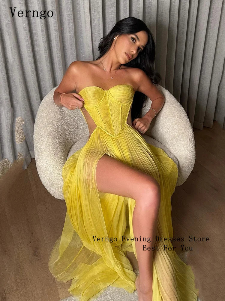 Verngo Yellow Chiffon Evening Dress Sweetheart A Line Sexy Prom Gowns Side Slit Prom Party Dresses vestido madrinhas Customized