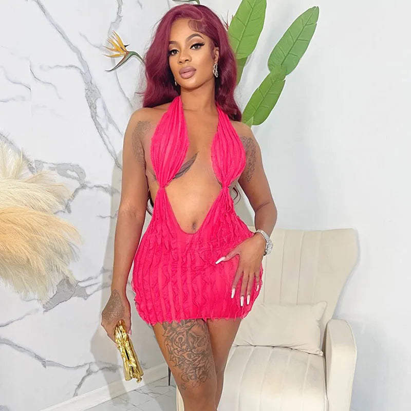 Sexy Wave Ruffles Mesh Birthday Dress for Women Backless Halter Deep V-neck Sleeveless Night Club Mini Party Dresses Vestidos