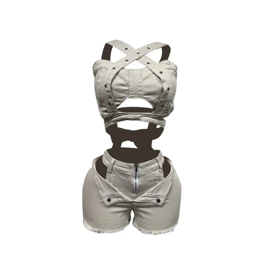 2 Piece Sets Women Denim Shorts Suit Sexy Vest Top Strap Backless Jeans Short Pants Pockets Outfits 2025 Streetwear Ensemble