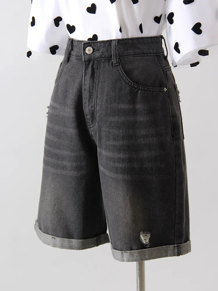 Women Denim Shorts Ripped Wide Leg Black High Waist Short Jeans Straight Leg Blue Denim Shorts For Women Summer Jean Shorts