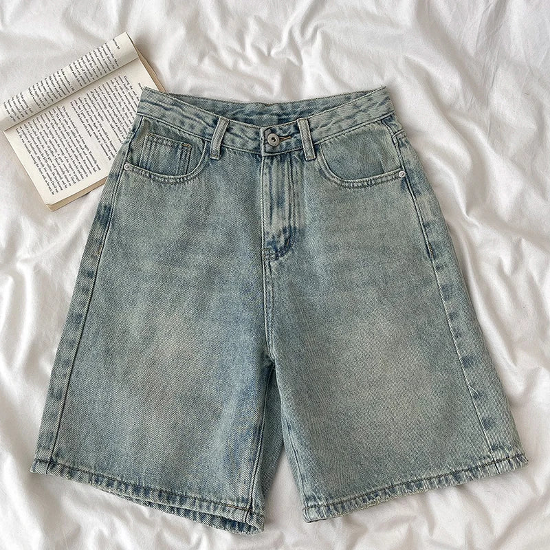 Retro Denim Shorts Women Summer High Waist Loose Wide Leg Straight Short Pants Versatile Casual Half Pants Female Streetwear