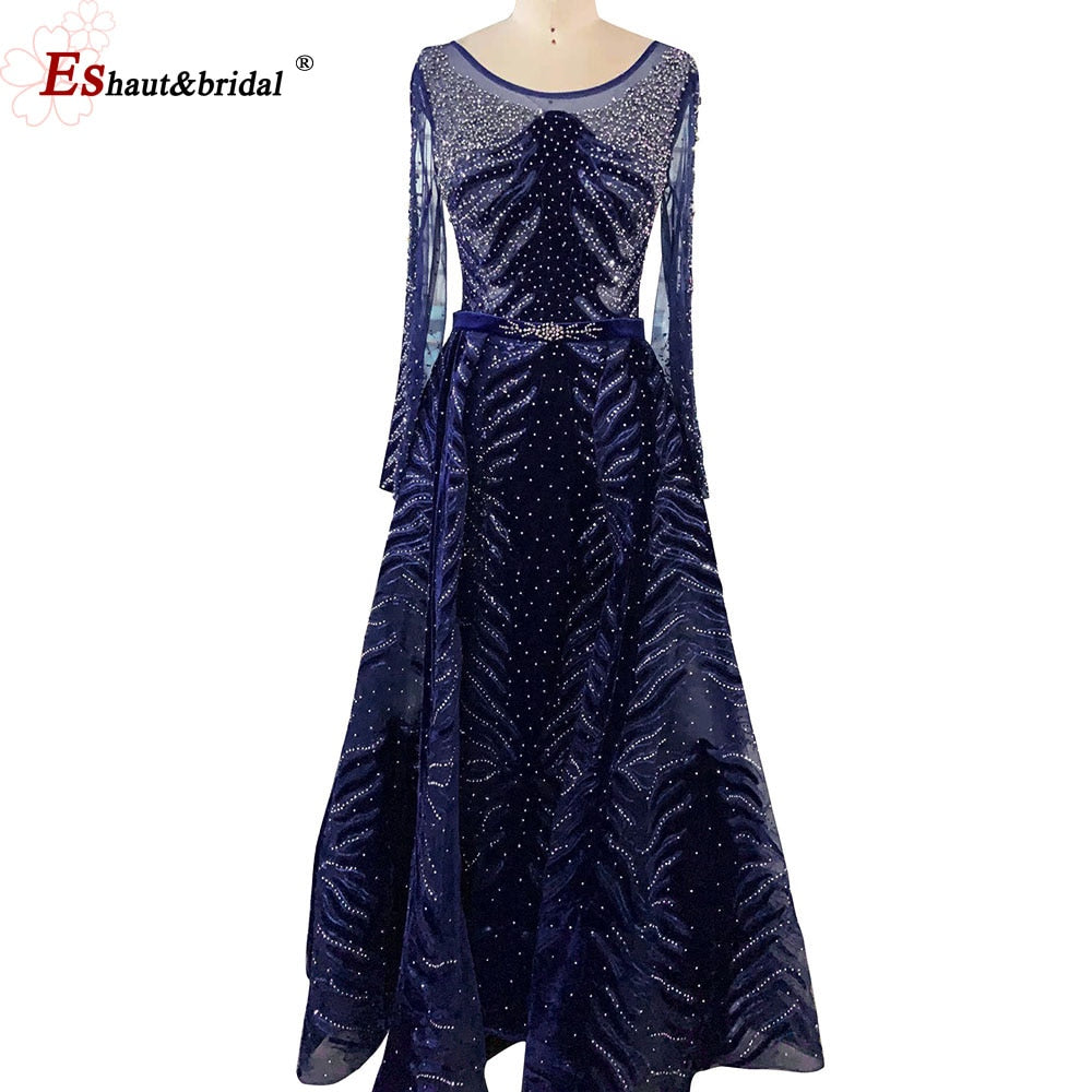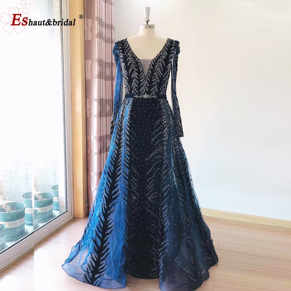 Elegant Mermaid Evening Night Dress for Women 2023 V-Neck Long Sleeves Velvet Crystal Plus Size Formal Wedding Prom Party Gowns