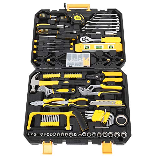 Details: Features: 1. High Quality: Forged from high-quality steel and finished in high-polish chrome,strength, durability, anti-corrosion protection 2. Suitable for many people:Perfect for Handyman's, repairmen, construction workers, mechanics, body shops etc. also a great tool set to have at home, garage and the workshop 3. Durability&Safe:The set comes in a durable blow mold case, keeping your tools safe in your house or garage 4. Easy To Carry&Storage:Housed in a handy blow-molded case for easy tool storage and portability. Its sturdy interior and organizer keeps tools in place Package Includes: 1 x 3/8" Ratchet Handle 6 x Combination Wrench 5/16-3/8-7/16-1/2-9/16-5/8 1 x 8" Adjustable Wrench 9 x Hex Key Wrench 1/16-5/64-3/32-1/8-5/32-3/16-1/4-5/16-3/8 1 x 8" Water Pump Pliers 1 x 6" Long Nose Pliers 1 x 6" Combination Pliers 1 x 7" Crimping Pliers 12 x 1/4" dr. Socket 5/32-3/16-7/32-1/4-9/32-5/16-11/32-3/8-13/32-7/16-15/32-1/2 10 x 3/8" dr. Socket 5/16-3/8-7/16-15/32-1/2-9/16-19/32-5/8-11/16-3/4 1 x 3/8*3" Extension Bar 1 x 1/4&3/8 Adaptor 1 x 5/8*16MM Spark Plug 1 x 3M/10FT Measure Tape 5 x Precision Screwdriver(-)/( )2.4 2.0 ( )3.0 4 x Screwdriver(-)/( )6*100 6*38MM 1 x Bits Driver Handle 20 x 25MM Bits 10 x 50MM Long Bits 1 x 60MM Magic Bits Holder 100 x 100pcs Hardware Assortment 1 x 9" Level 1 x Snap-off Knife