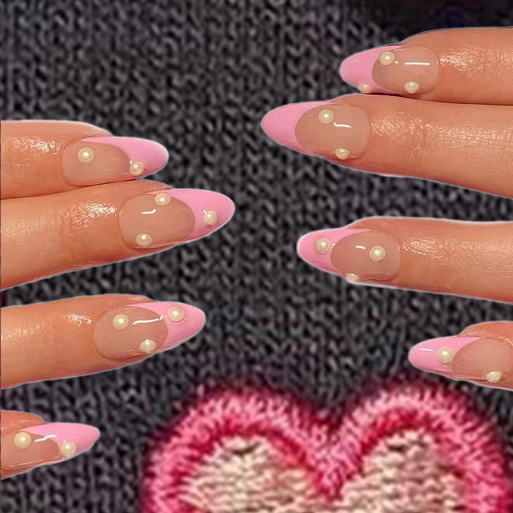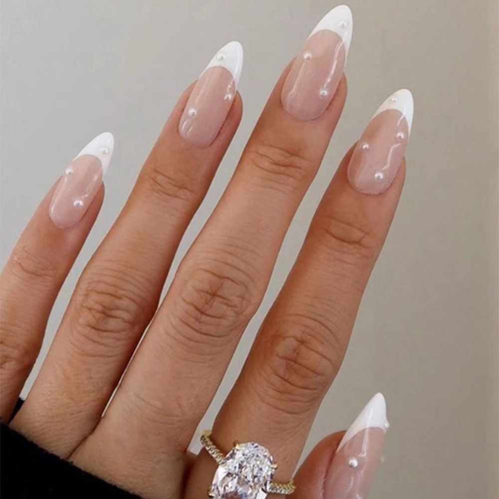 24Pcs Detachable Almond False Nails with Pearl Decoration Elegant Designs French Fake Nails Full Nail Art Tips Press On Nails