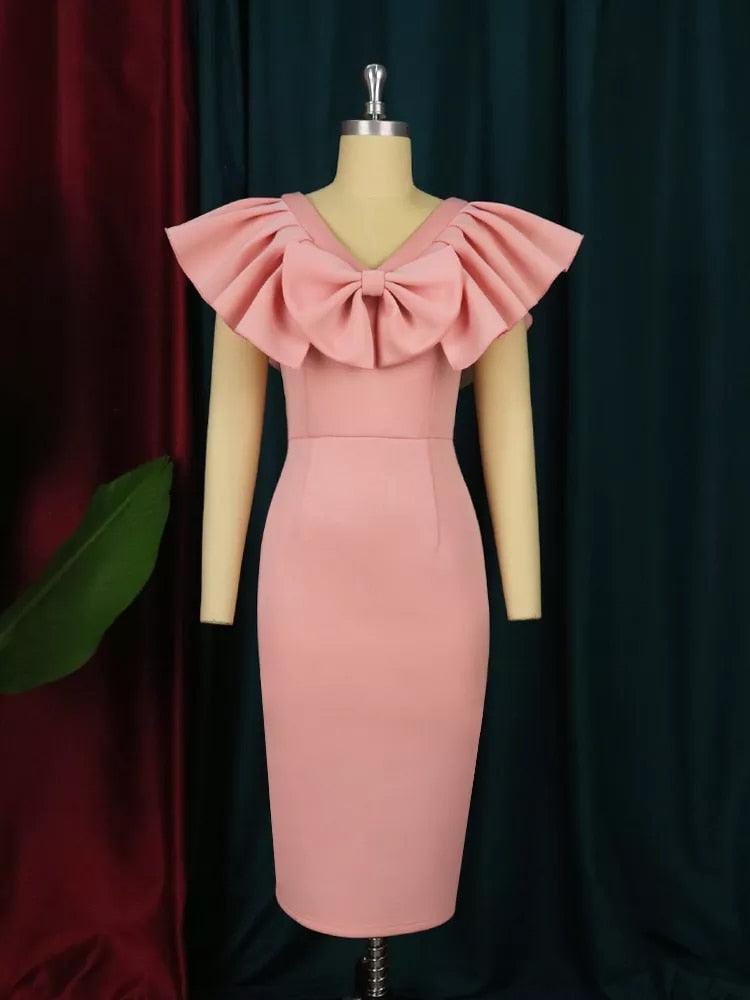 Sexy Pink Party Dress Bodycon Ruffle with Bow Elegant Women V Neck Slim FitSPECIFICATIONS