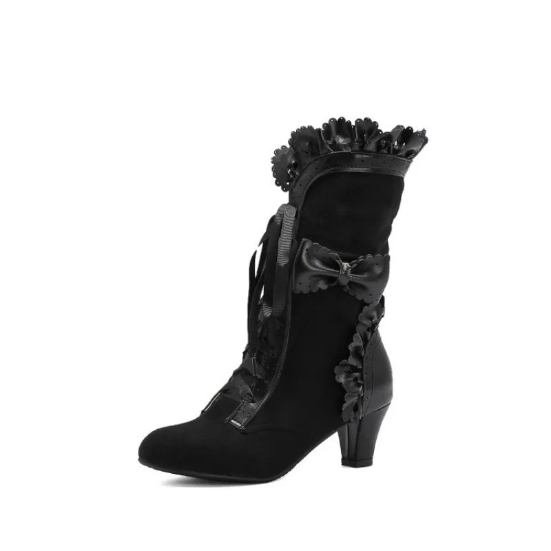 Autumn Winter Vintage Women Victorian Boots Lace Up High Heel Bootie Ruffle Trim Lolita Princess Cosplay Tea Party Costume ShoesSPECIFICATIONS