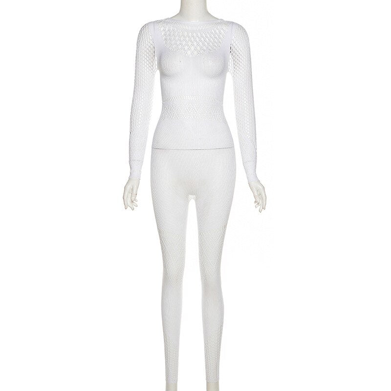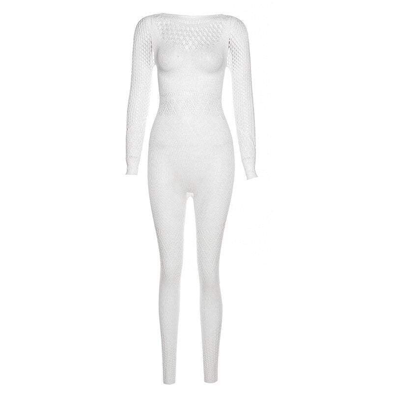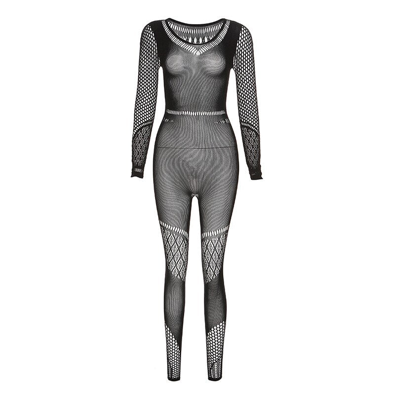 BoozRey Sexy Mesh Perspective Hollow High Waisted Trousers Long Tight Jumpsuit Women Skinny Long Sleeve Black Outfits Overalls