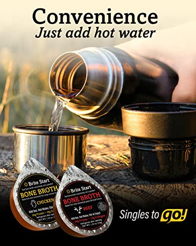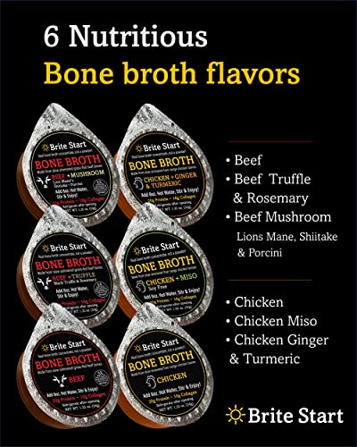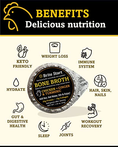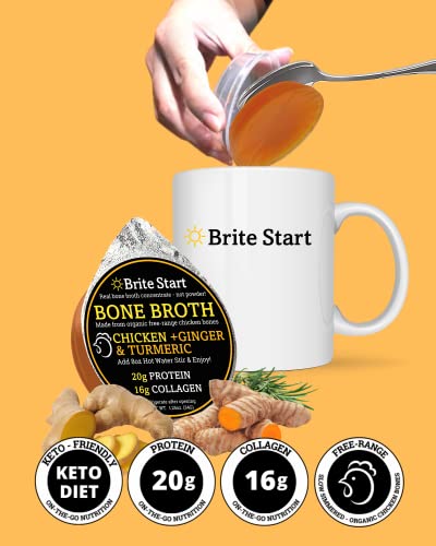Brite Start Bone Broth - Chicken + Ginger & Turmeric - 12 Count - Keto Friendly Concentrate with 16g Collagen, 20g Paleo Protein - Made from Organic Free Range Chicken Bones - Single Serve PacketsBrand: Brite Start