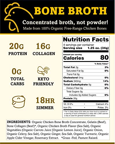 - PREMIUM INGREDIENTS - MADE FROM ORGANIC FREE-RANGE CHICKEN BONES - Our bone broth is slow simmered for 18 hours. We use organic vegetables, herbs and spices. Humanely raised and ethically sourced ingredients free from antibiotics, hormones, dairy, gluten, fillers, artificial ingredients and preservatives. Non-GMO.