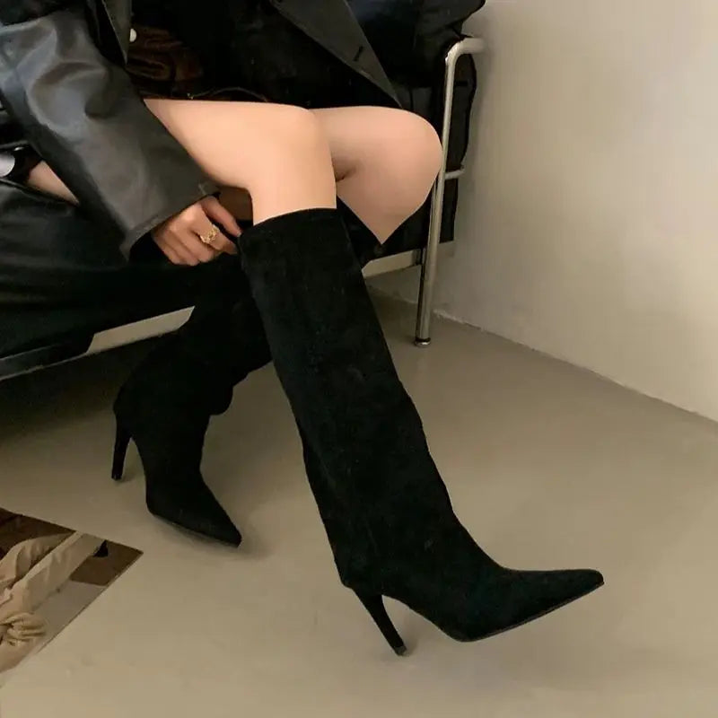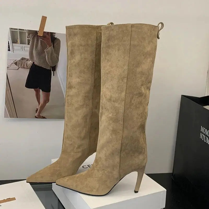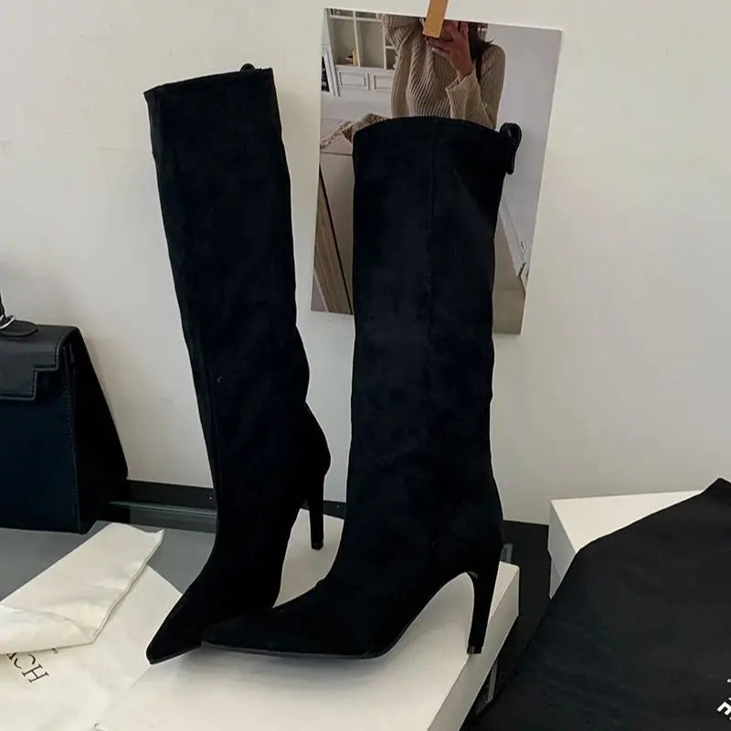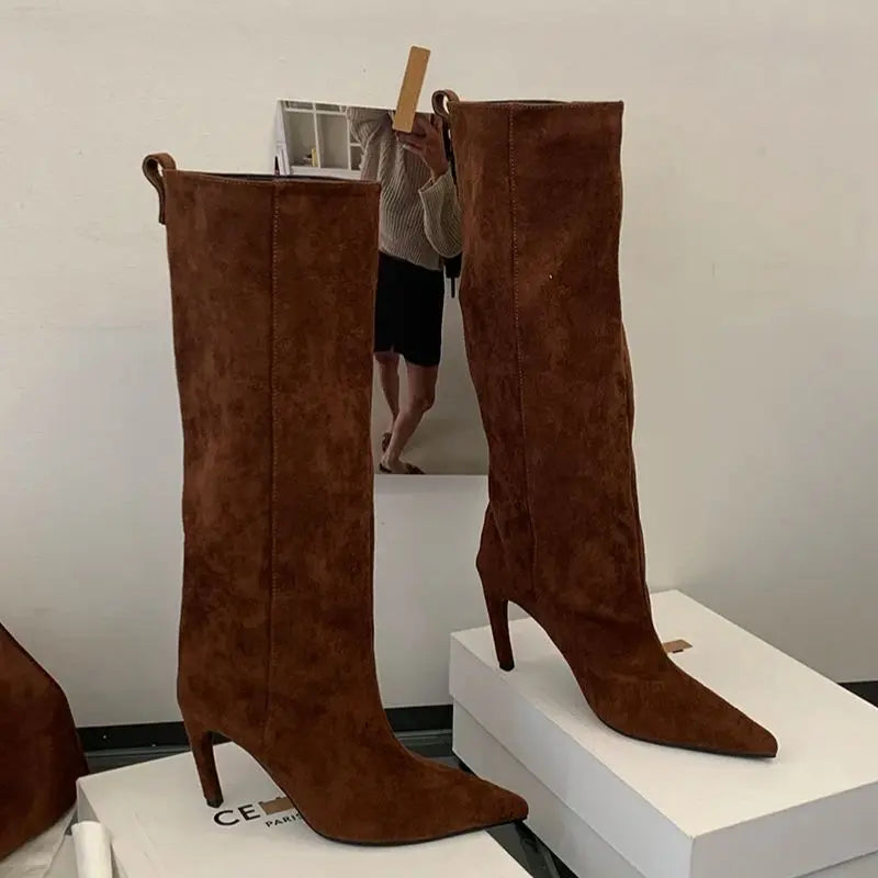 Brown Boots Knee High Long Shoes Woman Pointed Toe High Heels Suede Boots Autumn Winter Black Shoes 2025 New Arrival