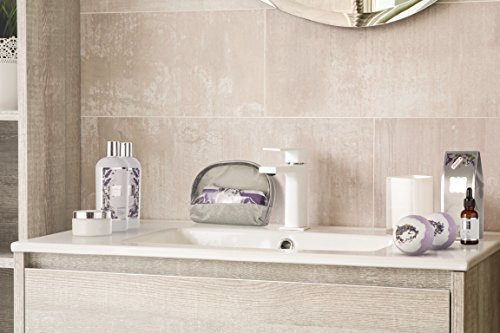 Details: ALL GIFT OCCASIONS Give the gift of total relaxation with this luxurious bath set from Lovery. Whether you need a gift for a significant other, sister, mother or friend, this set is perfect for nearly any occasion. Featuring all the pampering necessities, the set is completed with a beautiful ribbon and note tag to write a personalized message. No gift wrapping required! Give this set for birthdays, anniversaries, Mother's Day, Valentine's Day, Christmas and more. ULTIMATE RELAXATION Pamper yourself with any of the nine beauty products included in our set. Choose from the bubble bath soap, bath salts or fizzers, add to your bath water and let the troubles of your day melt away during a relaxing soak. Our set gives you everything you need for a perfect spa night in. DELUXE BATH BOMBS This spa kit includes two huge 5-ounce bath bombs that will fizzle and foam creating a wonderfully sudsy bath experience. The multi colored bombs are beautifully scented with fresh lavender, adding a soothing aroma to relax and calm you after a long day. YOUR BEAUTY ESSENTIALS Our package includes seven skin essentials and two bath accessories inside the cute bathtub basket. All of the beauty items are formulated with shea butter and vitamin E to soothe, moisturize and protect your skin. Accessories include a shimmery silver cosmetic bag and purple exfoliating loofah. SOOTHING AROMATIC PRODUCTS All of the beauty products feature a combination of lavender's rich herbal aroma and jasmine's soft floral notes for a truly beautiful scent. The soothing properties of lavender will work to relax and calm, perfect to prepare you for a night of relaxation at home and a restful night's sleep. -Paraben free -Not tested on animals -Includes shower gel, bubble bath, bath salt, body butter, two 5-ounce bath bombs, lavender bath oil, loofah and cosmetic bag.