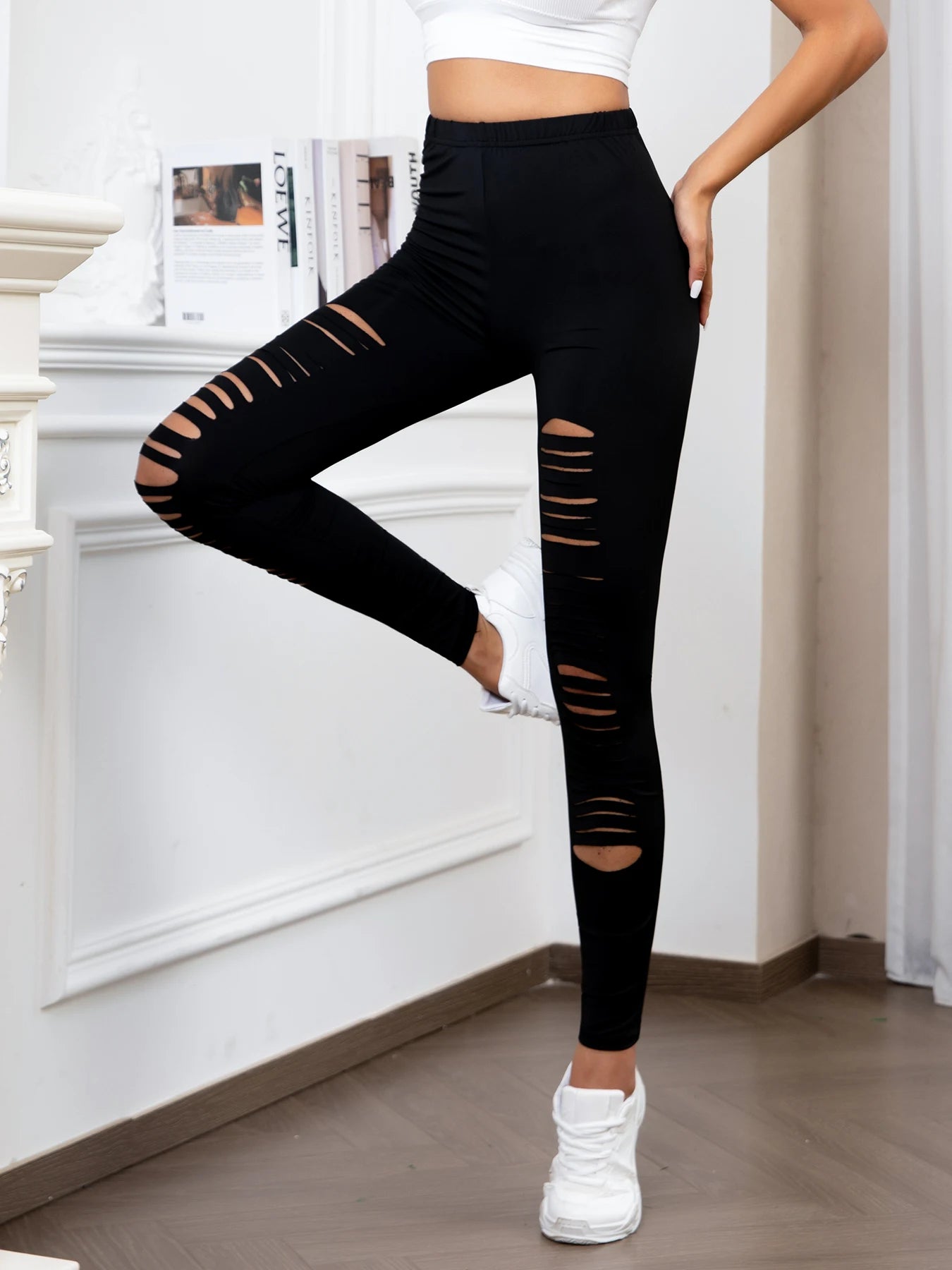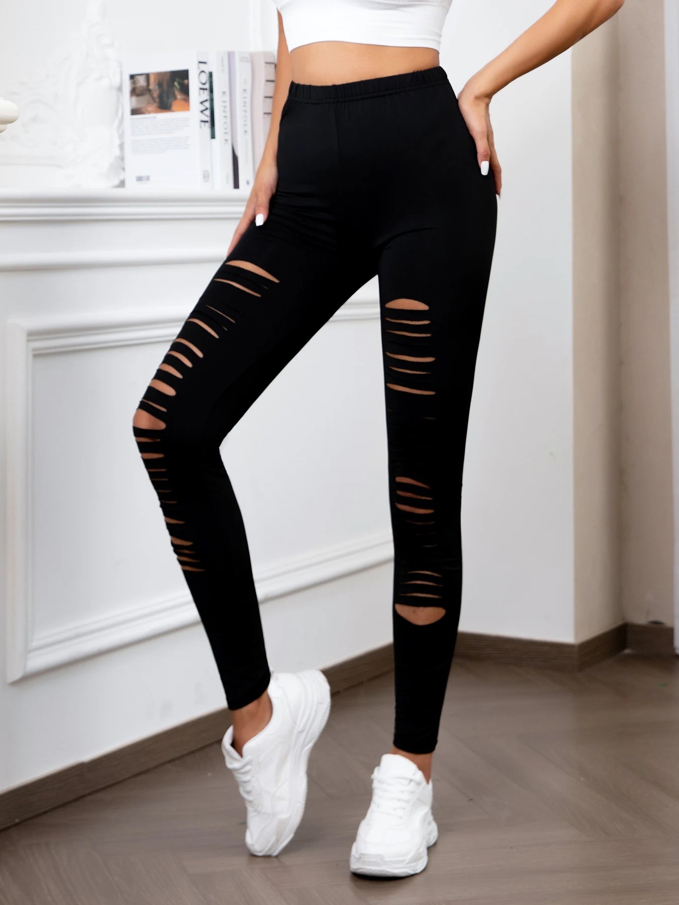 Europe And The United States New High-waisted Leggings Personality Ripped Stretch Nine Pants Solid Color Tight Leggings Women