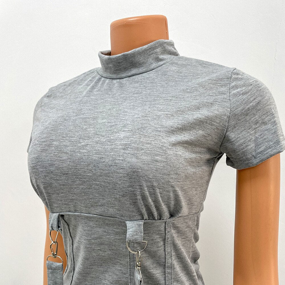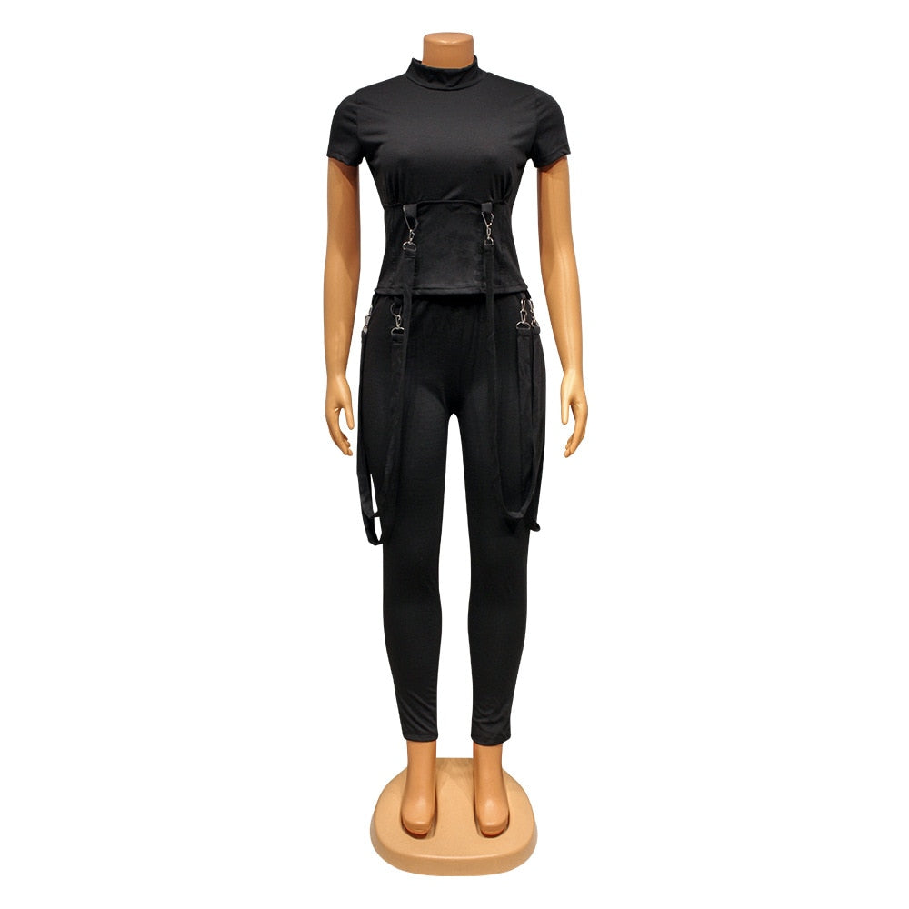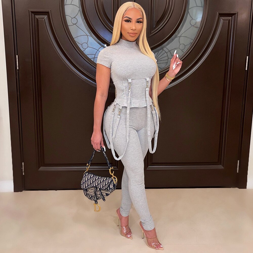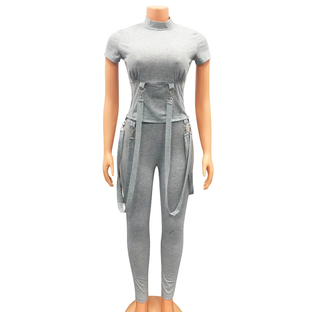 Fashion Black Grey Locomotive Style Tracksuit Women Casual O Neck Short Sleeve Top + Pants Slim Club Two Piece Set Jogging Femme