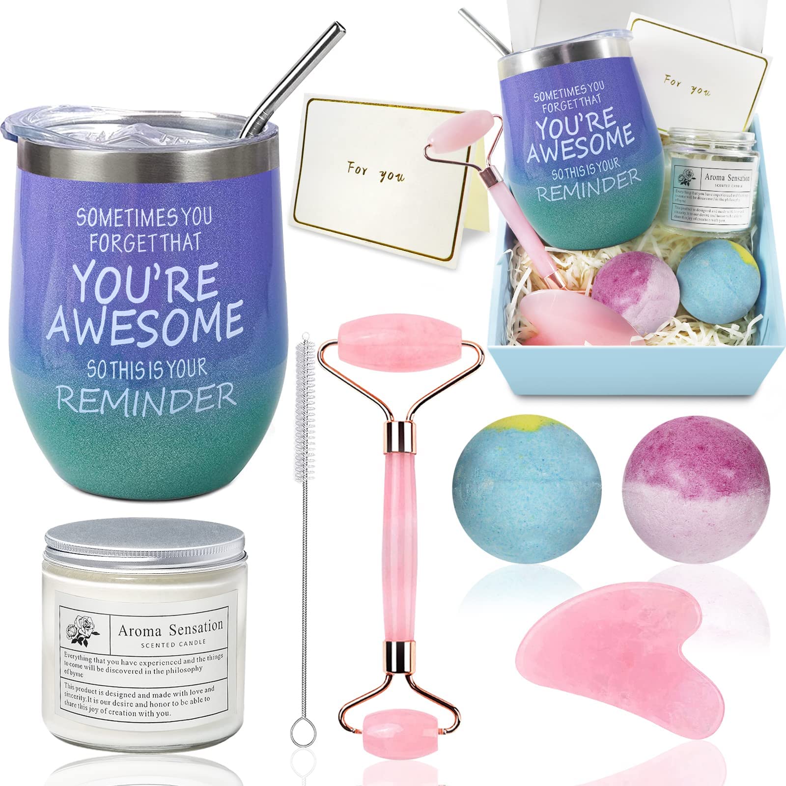 - 🎁 【Unique 7pcs Birthday Gifts for Women】Well-designed packaging box contains the most popular wine tumblers, scented candle, face rollers & guasha set, 2 bath bombs, and greeting card. A quote “YOU ARE AWESOME” makes the mug be a unique gift to celebrate her birthday time. Best gift ideas for wife, mother, sister, daughter, best friend, coworker, or girlfriend.