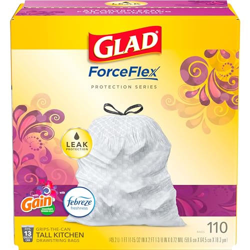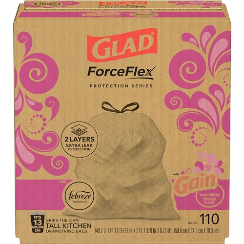 GLAD ForceFlex Tall Kitchen Drawstring Trash Bags, 13 Gallon White Trash Bag for Kitchen Trash Can, Gain Moonlight Breeze with Febreze Freshness and Leak Protection, 110 Count (Package May Vary)Brand: Glad