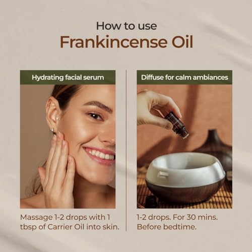 - FRANKINCENSE ESSENTIAL OIL FOR SKIN: Frankincense Oil is used in organic skincare for its skin-related properties. Apply with a Carrier Oil for face and skin.