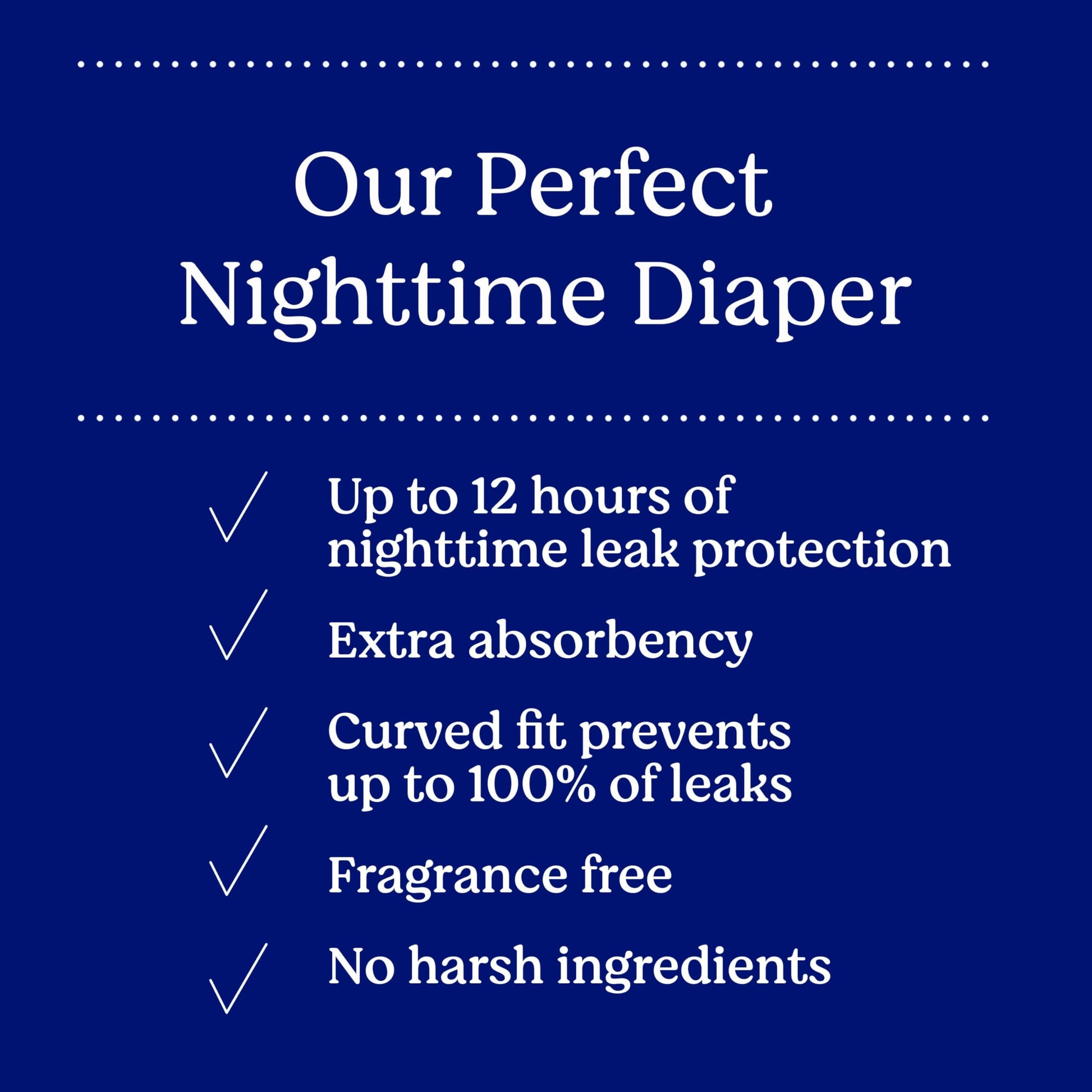 - Our Perfect Nighttime Diaper: Overnight diapers feature a DryTouch Liner that quickly absorbs moisture and provide up to 12 hours of nighttime leak protection for all-night comfort, dryness and protection