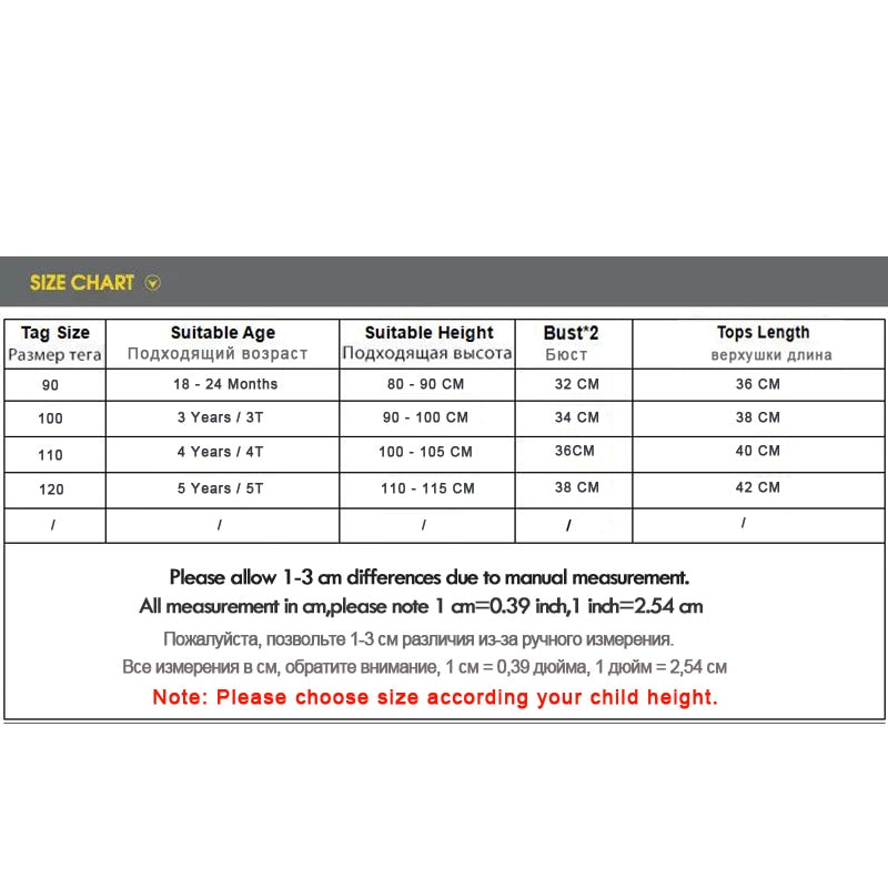 Note: Please choose size according your child height. Please allow 1-3 cm differences due to manual measurement. All measurement in cm,please note 1 cm=0.39 inch,1 inch=2.54 cm | |||||