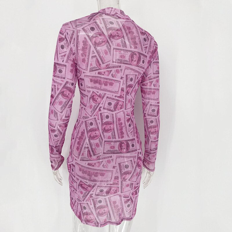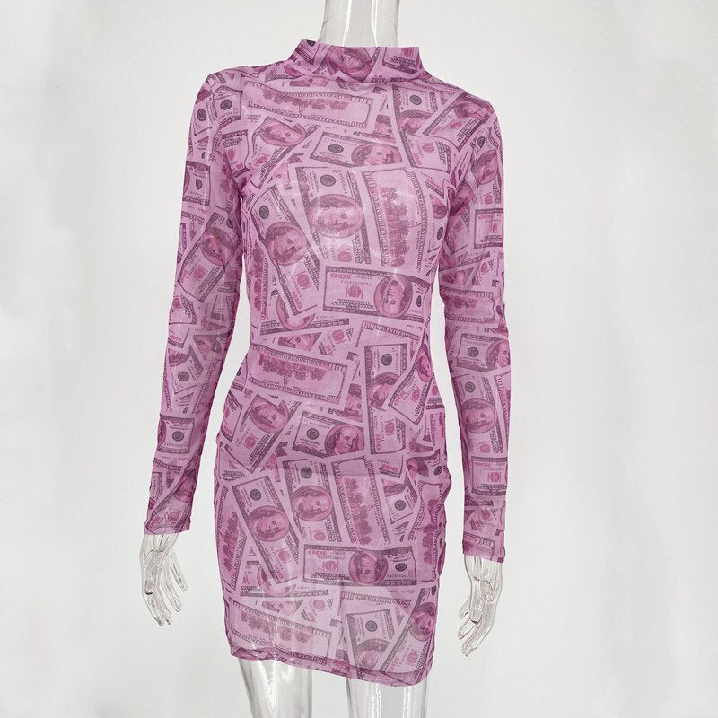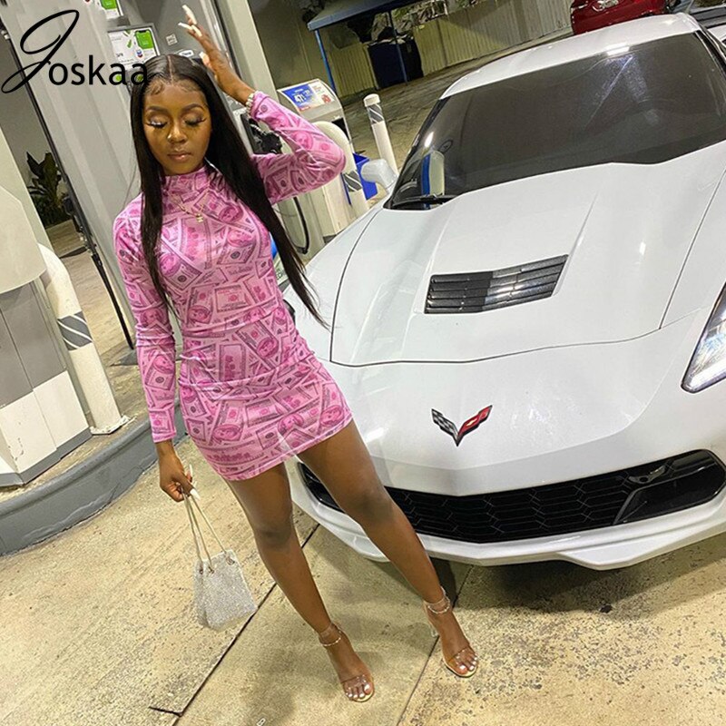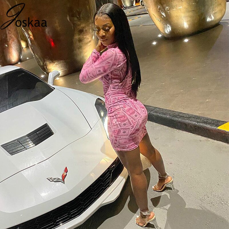 Joskaa Money Graphics Mesh Print Long Sleeve Dresses for Women Street Casual Wear Basic Trend Bodycon Mini Dress Mujer 2020