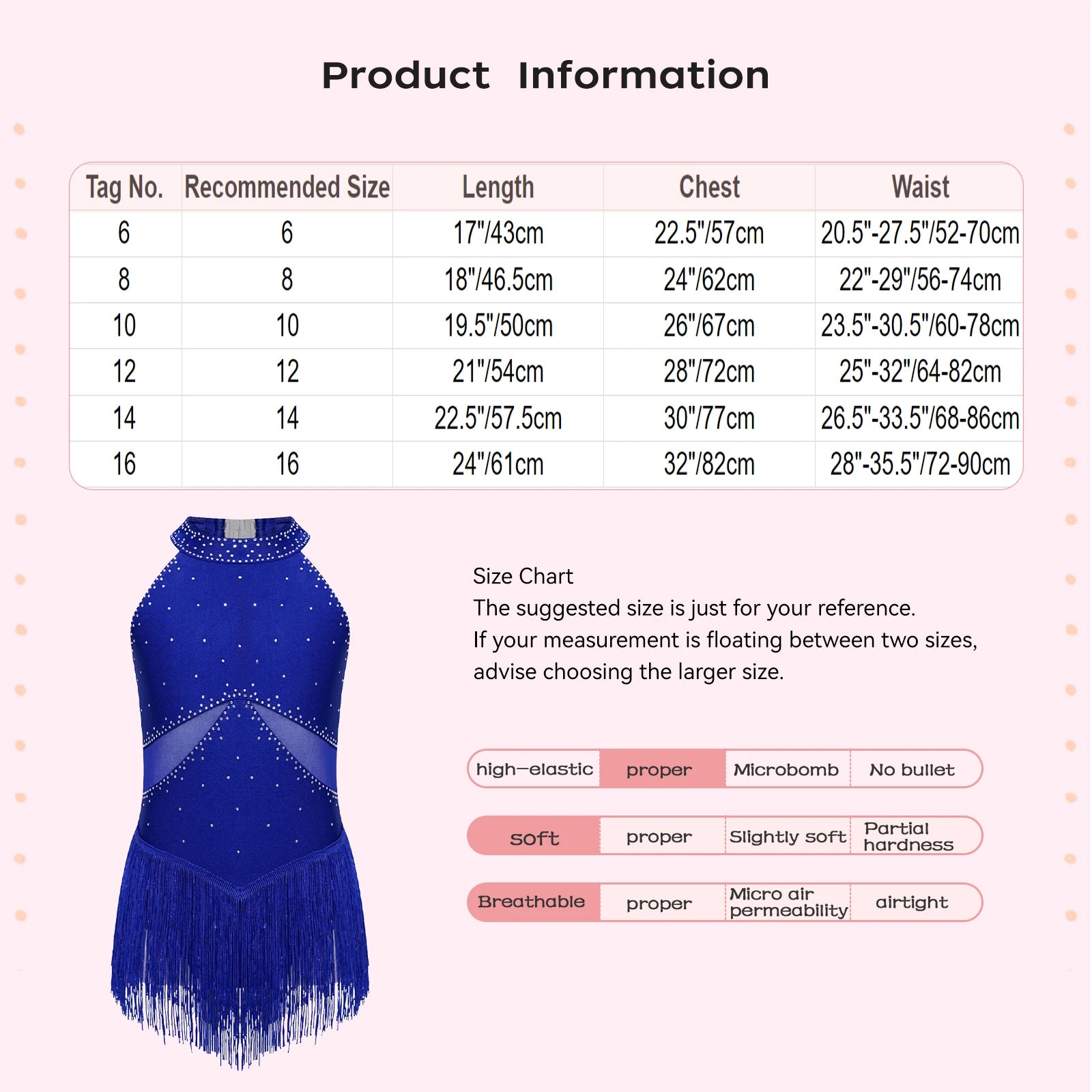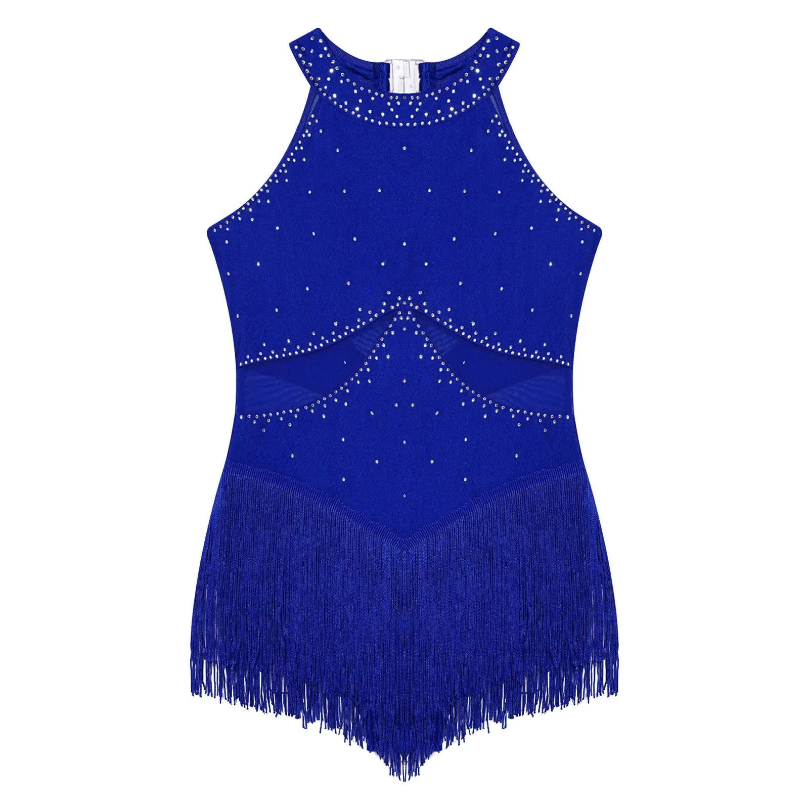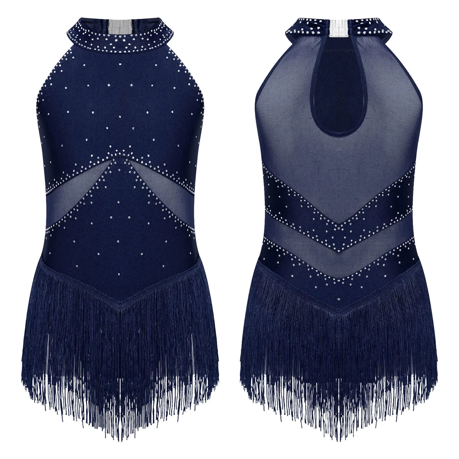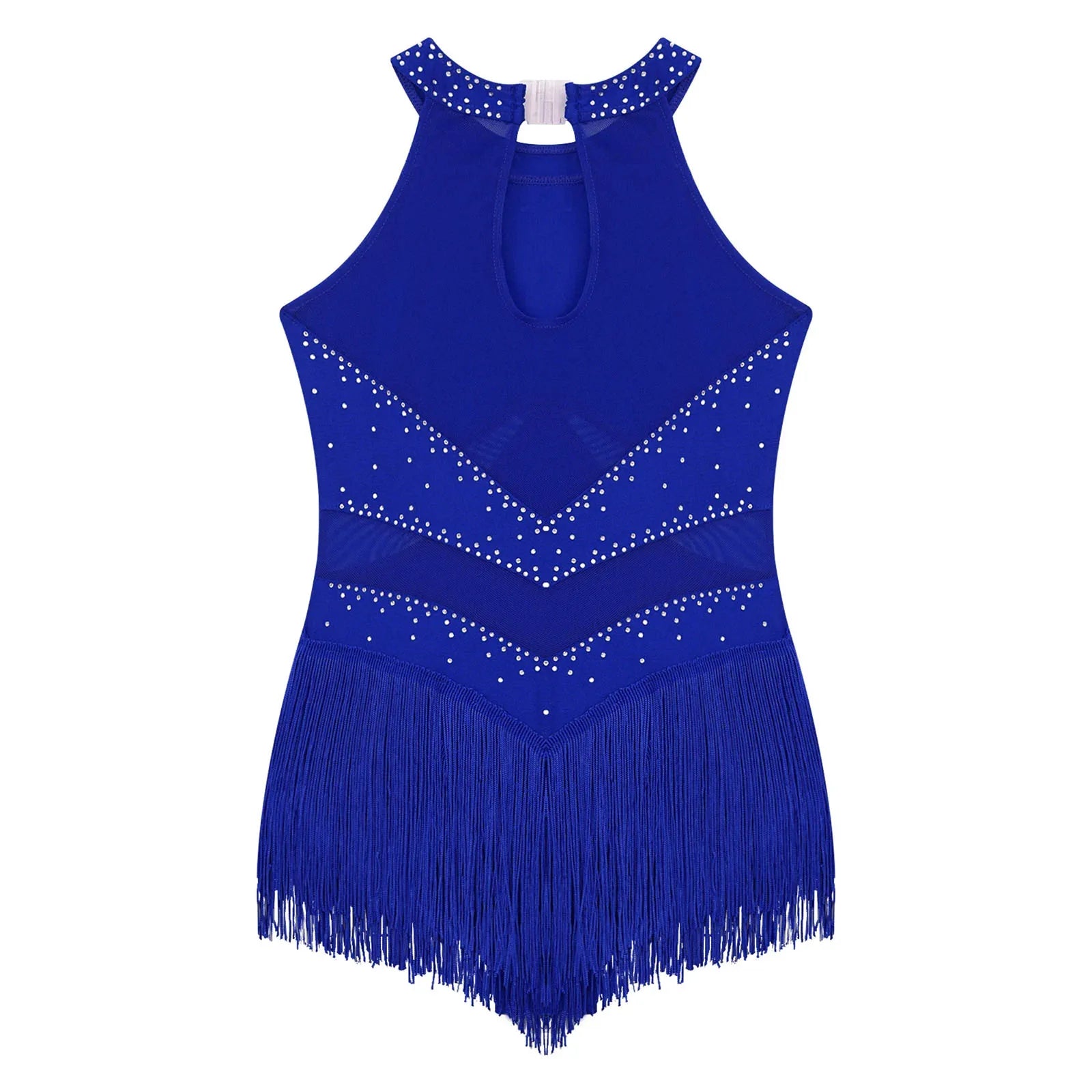 Kids Girls Sleeveless Fringed Bodysuit Moden Latin Jazz Dance Leotard Dress Rhinestones Gymnastics Skating Performance Costumes