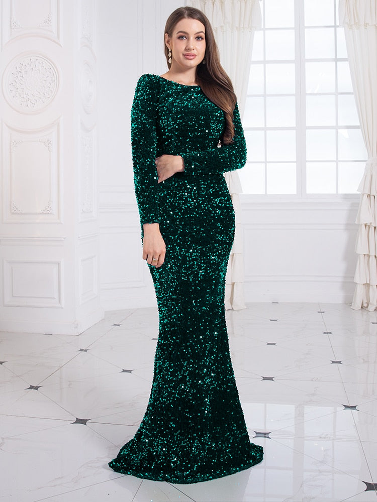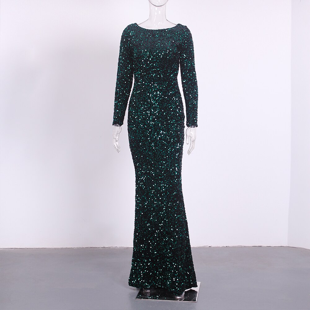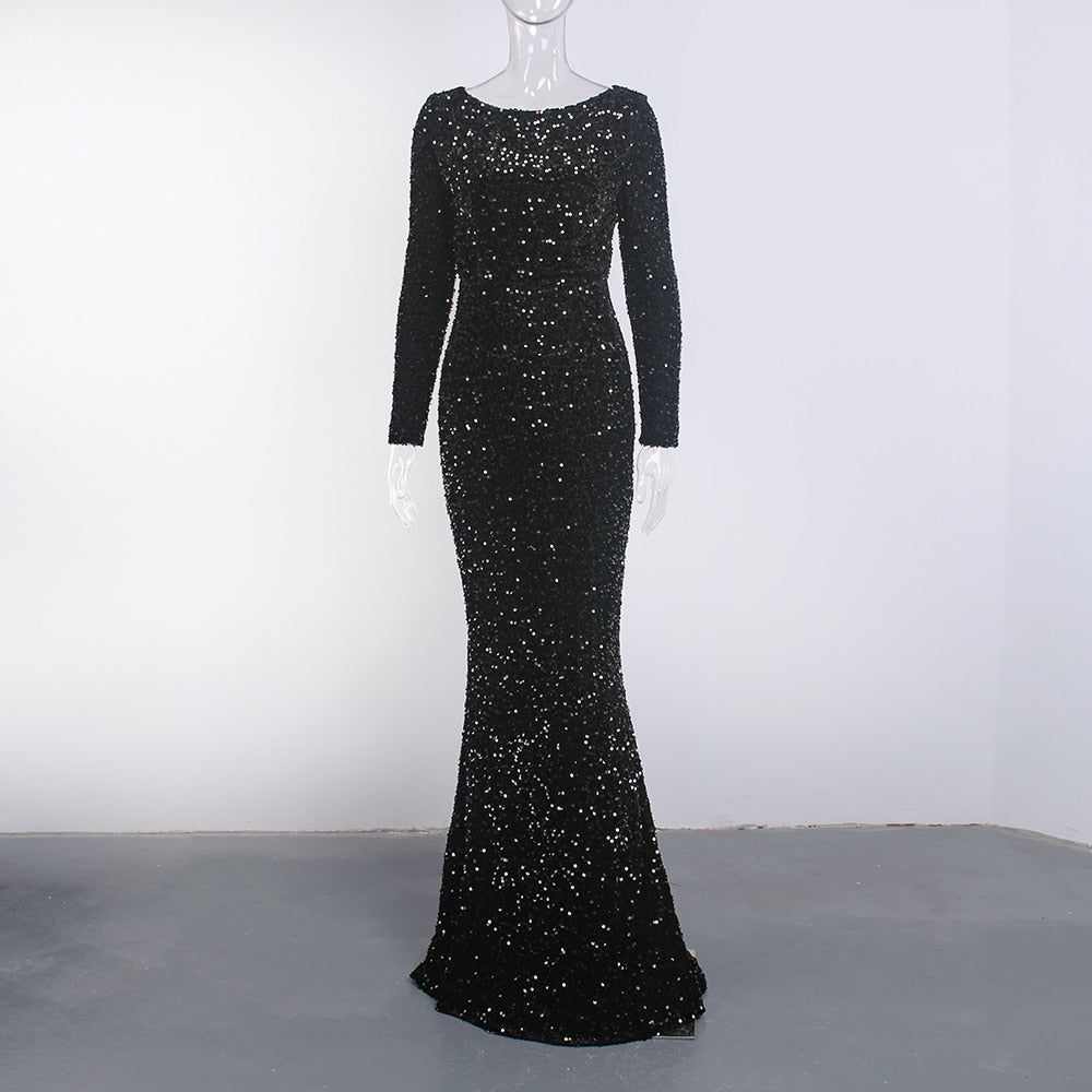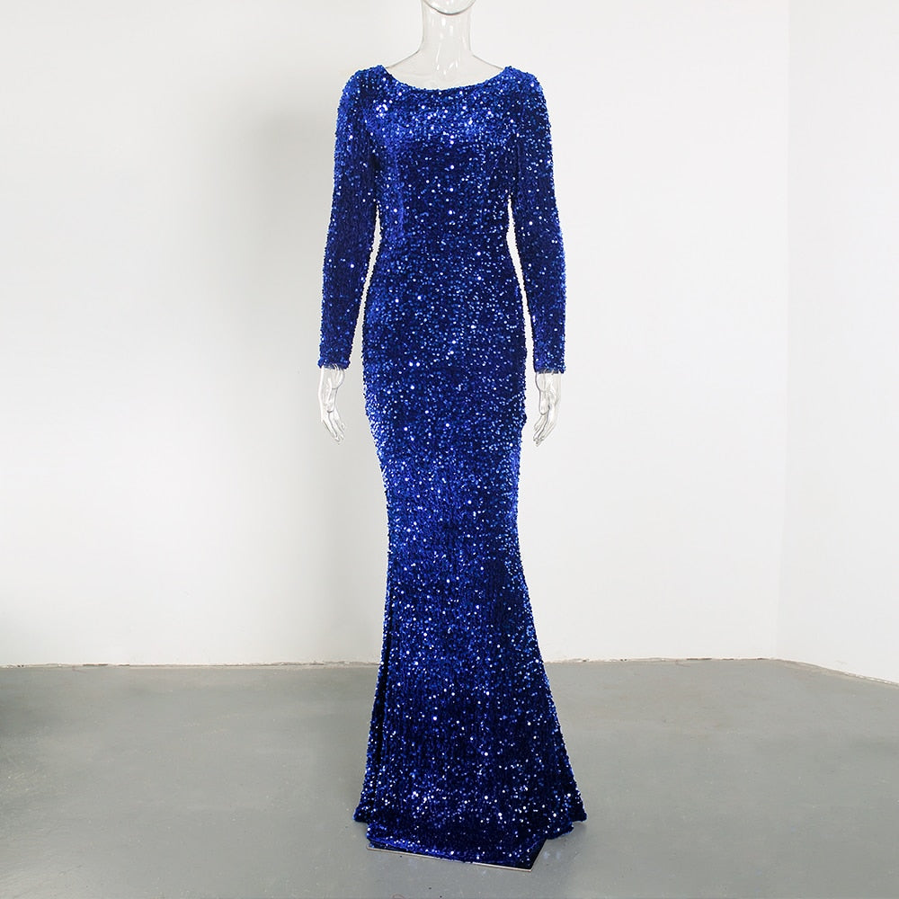 Kisscc Royal Blue Stretch Sequin Floor Length Evening Night Dress Full Sleeve Bodycon Black Mermaid Party DressSPECIFICATIONS