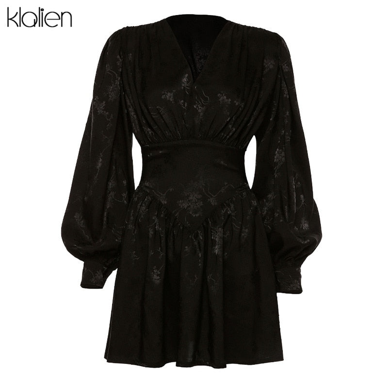 KLALIEN Fashion Black Chiffon Printing Elegant Loose Mini Dress New Women Lantern Full Sleeve Pleated Slim Party Night DressesSPECIFICATIONS