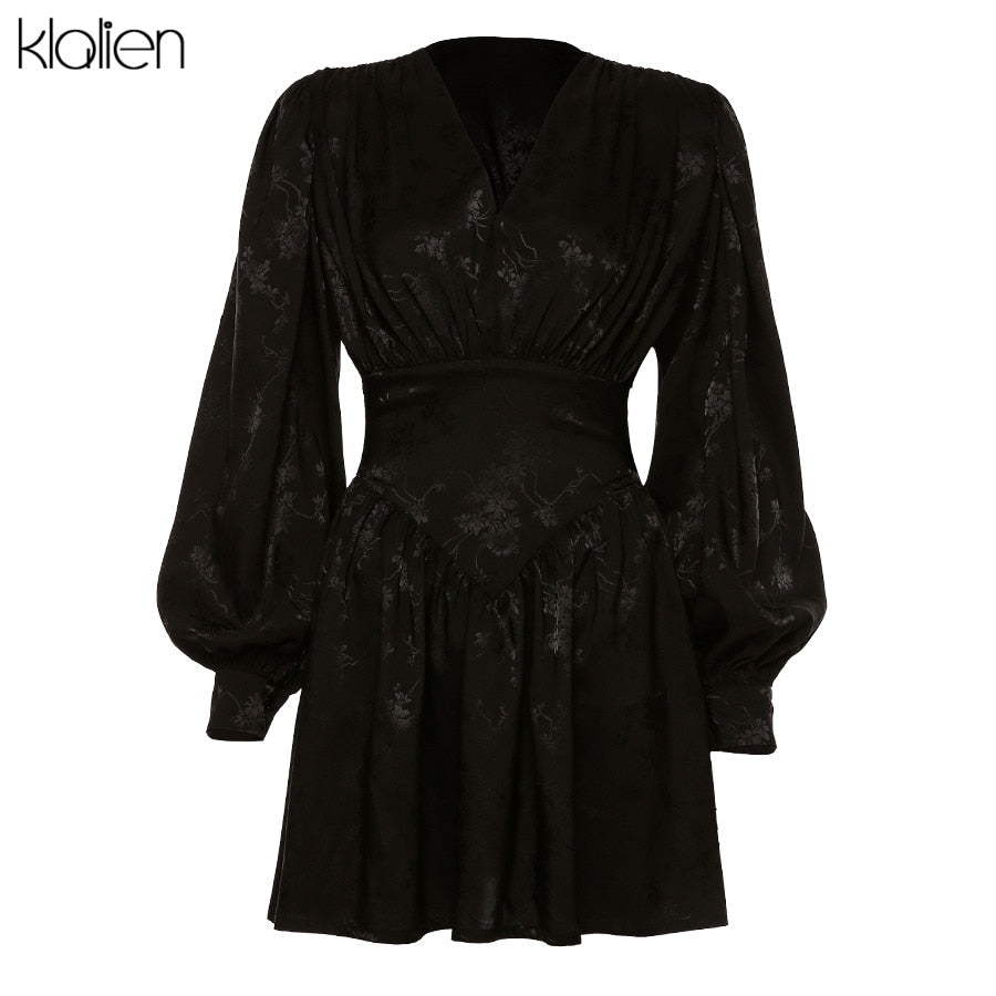 KLALIEN Fashion Black Chiffon Printing Elegant Loose Mini Dress New Women Lantern Full Sleeve Pleated Slim Party Night Dresses