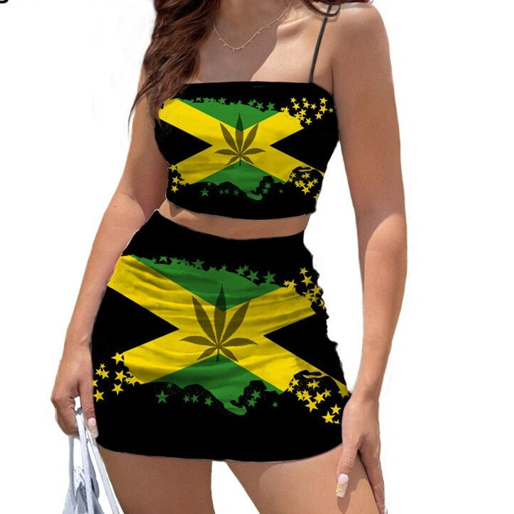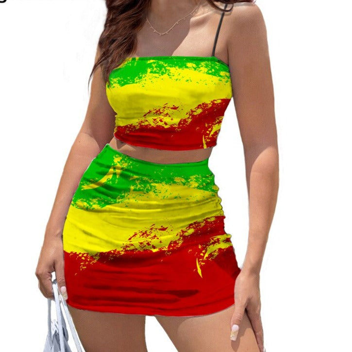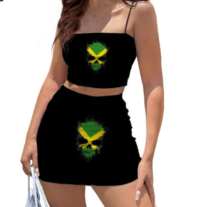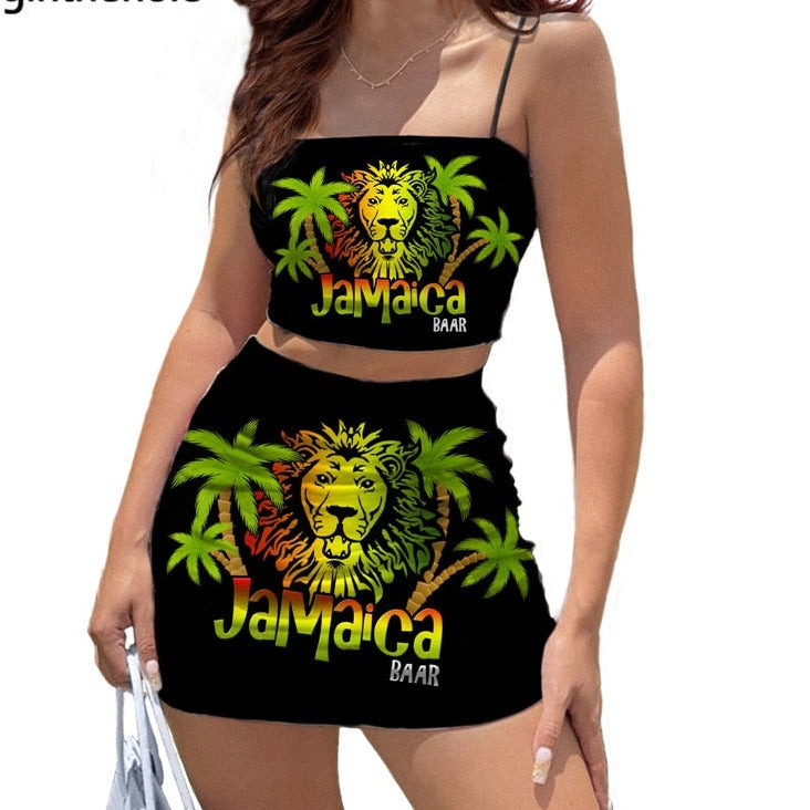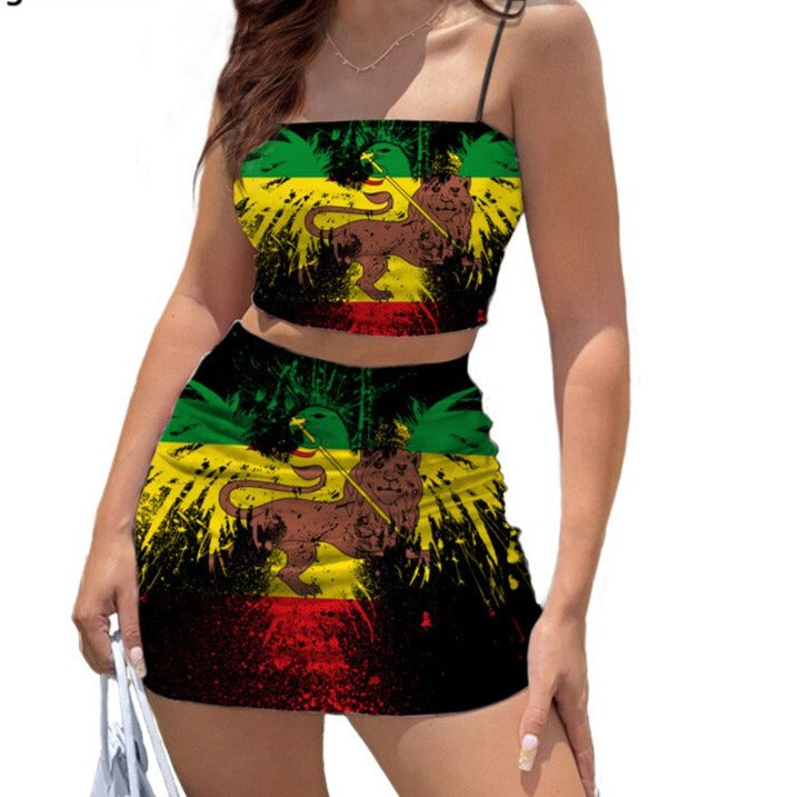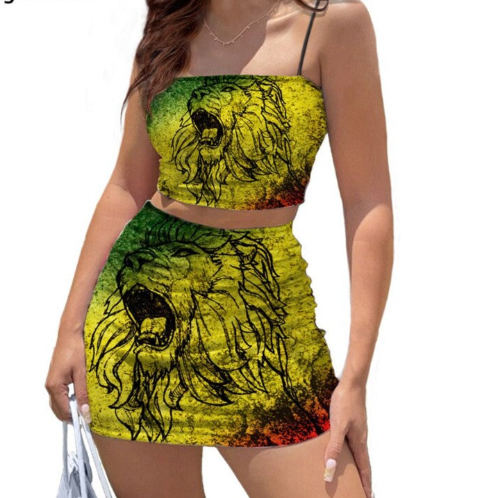 Lion Print Jamaica Flag Pattern Sexy Stylish Women Mini Dress Halter Spaghetti Strap