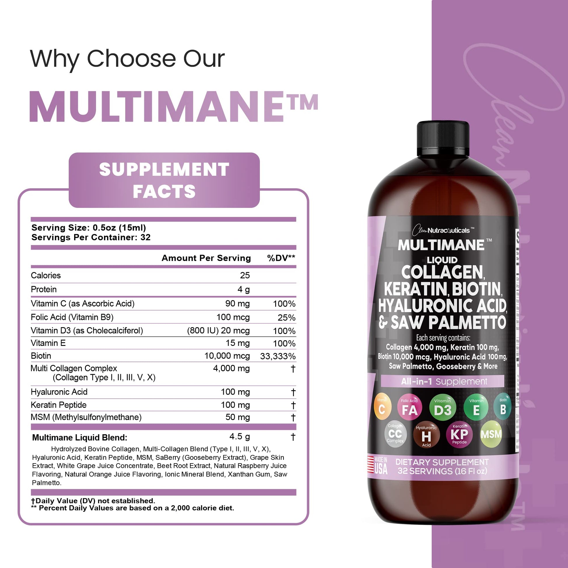 - Advanced Collagen Liquid for Women and Men - MultiMane Liquid Biotin and Collagen Supplements includes multi collagen drops (types I, II, III, and IV), biotin vitamins for hair skin and nails, keratin supplements, and hyaluronic acid supplements and more. Forget the hair mask for dry damaged hair and growth and keratin hair mask. Clean Nutra has proven to create unmatched collagen supplements for women and collagen for men that contain both type 1 collagen and type 2 collagen in each serving.