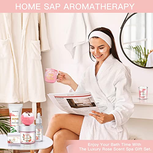 - SPA SET FOR WOMEN - Meet all women's skin care needs. It includes Essential Oils, Body Butter, Hand Cream, Rose Soap, Bath Bombs, Soy Candles, Coffee Mug, 7 pcs sets packaged in a rose gift box. Fuses traditional therapies and fragrant aromatherapy taking your skin and senses to a whole new level.