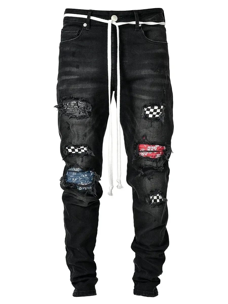 Best Selling Men Jeans Denim Pants Pencil Pant Slim Fit Hole Print Pockets Straight Trousers Casual Elastic Waist Lace Up Autumn 2024