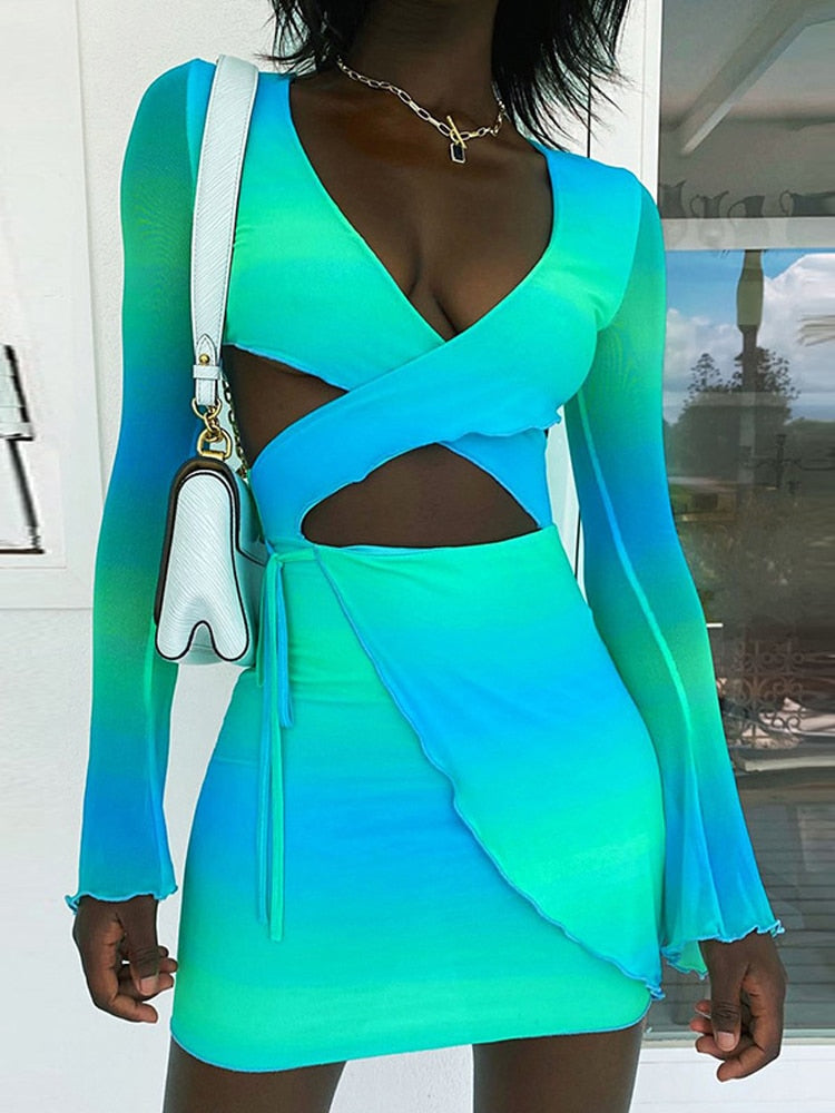 MHCMBSBS Sexy Tie Dye Bodycon Mini Dress Women Hollow Out Long Sleeve Mesh Skinny Club Outfits Summer 2022 Beach Party Sundress