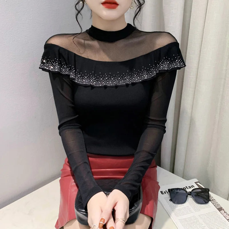 New 2025 Spring Autumn Long Sleeve T-Shirt Fashion Casual Turtleneck Diamond Woman Tee Elegant Slim Women's Tops Blusas