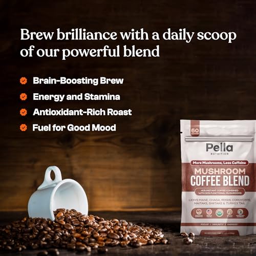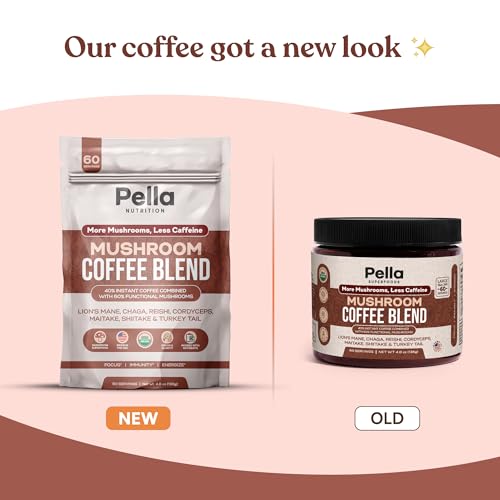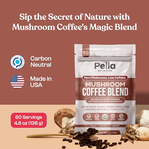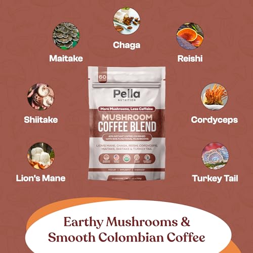 Organic Low-Caffeine Mushroom Coffee (60 Servings) with 7 Superfood Mushrooms, Great Tasting Colombian Instant Coffee, Includes Lion's Mane, Reishi, Chaga, Cordyceps, Shiitake, Maitake, and Turkey TailBrand: Pella Nutrition