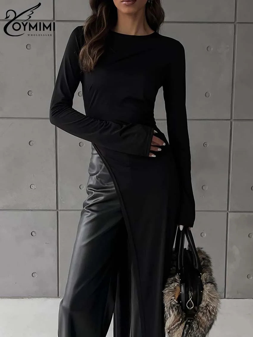 Oymimi Elegant Black Slim Women's Dress Fashion O-Neck Long Sleeve Solid Simple Dresses Spring New Irregular Floor-Length Dress