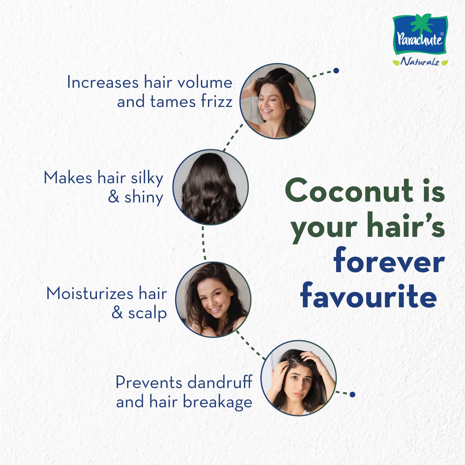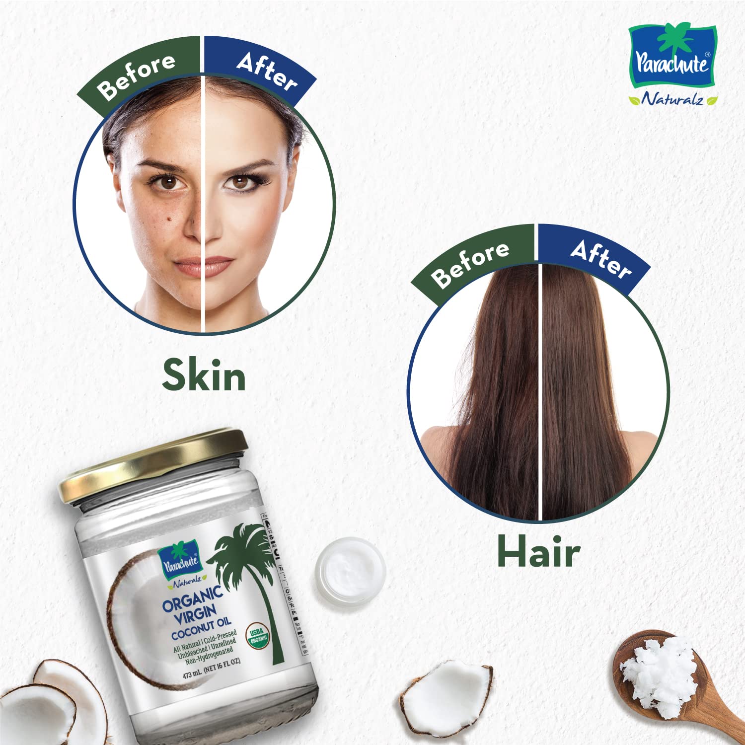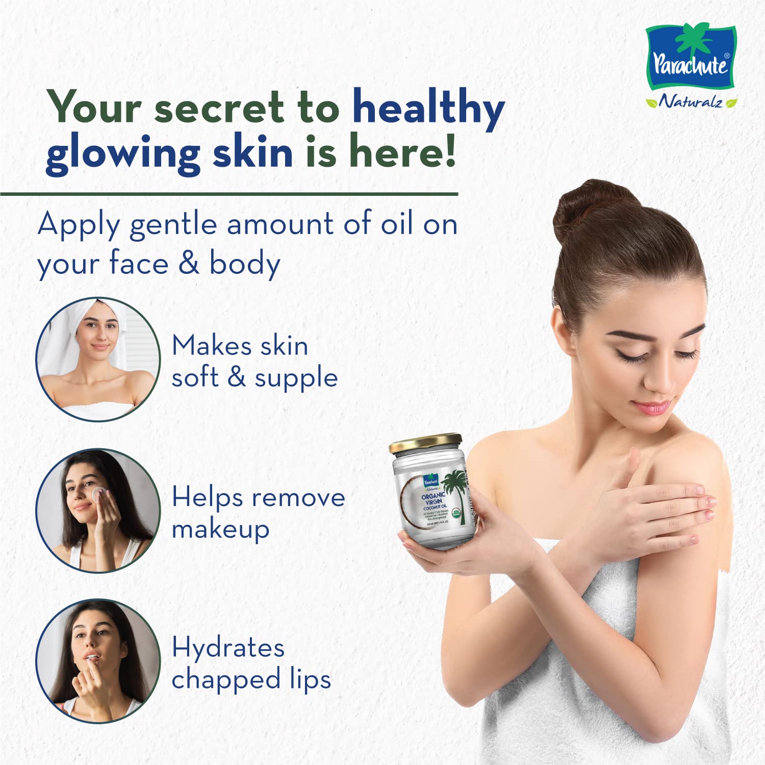 - RADIANT SKIN AND HEALTHY HAIR: This coconut oil for hair and skin acts as a great moisturizer and conditioner. Parachute Naturalz Organic Virgin Coconut oil can independently provide many benefits to skin and hair. With its antioxidant properties, this organic coconut oil for skin encourages the skin rejuvenation to make it look naturally glowing and nourished and prevents hair from further damage, making it look frizz free, moisturised, silky and voluminous.