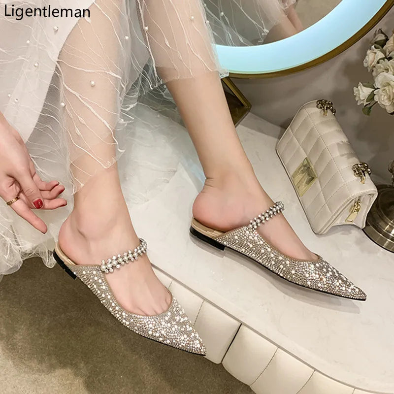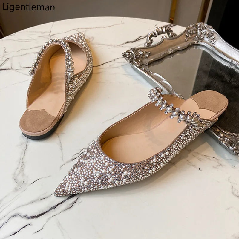 Pearl Slippers Shoes Women Basic 2023 Summer Flock Shiny Rhinestones Pointed Toe Flats Pearl Slippers Fashion Party Women Shoes