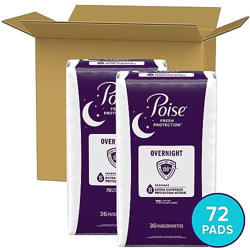 - Poise Overnight Incontinence Pads: 72 postpartum and incontinence pads, 8 drop extra coverage (2 packs of 36, 72 pads total); HSA/FSA-eligible; packaging may vary