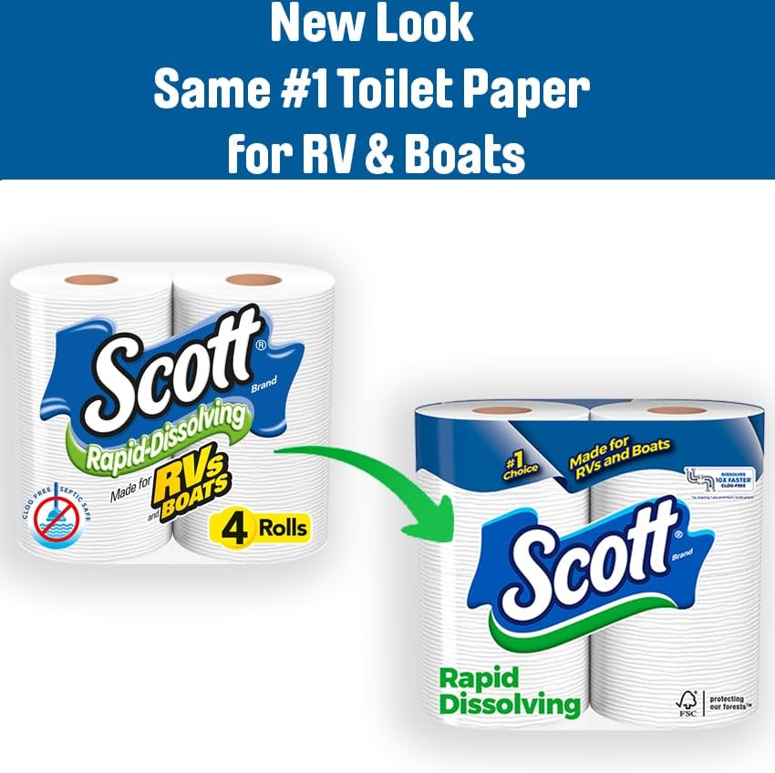 Details: Bringing Scott Rapid-Dissolving toilet paper—the #1 choice made for RVs, boats, buses, campers and more—into your home means spending less time worrying about clogged pipes and more time on what matters most. With Scott Rapid-Dissolving Toilet Paper, you get 8 Double Rolls of 231 sheets, so you have plenty of septic-safe toilet paper that breaks down after use. Our toilet paper is perfect for sensitive plumbing systems—it gets the job done but is still soft and gentle on skin. You won’t even have to worry about clogged pipes because Scott Rapid-Dissolving toilet paper is Clog Clinic tested and made of 100% biodegradable tissues. Use the septic-safe brand that has been trusted for generations to help protect your plumbing with Scott bathroom tissue. Each roll of Scott Rapid-Dissolving Toilet Paper features FSC-certified fiber and is made in the USA from domestic and imported materials. We’ve been trusted for generations: Each roll of Scott Rapid-Dissolving Toilet Paper features FSC-certified fiber and is made in the USA from domestic and imported materials. *vs the leading brand one ply