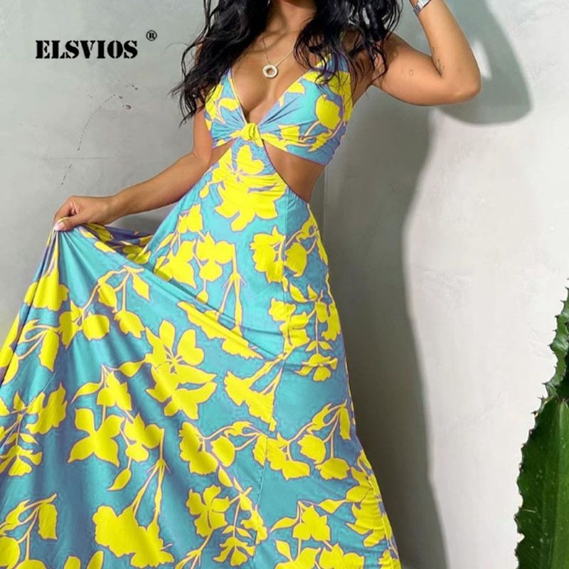Sexy Deep V-neck Backless Lace-up Dress Autumn Elegant Floral Print Swing Long Dress Lady Spaghetti Strap Party Dresses VestidosSPECIFICATIONS