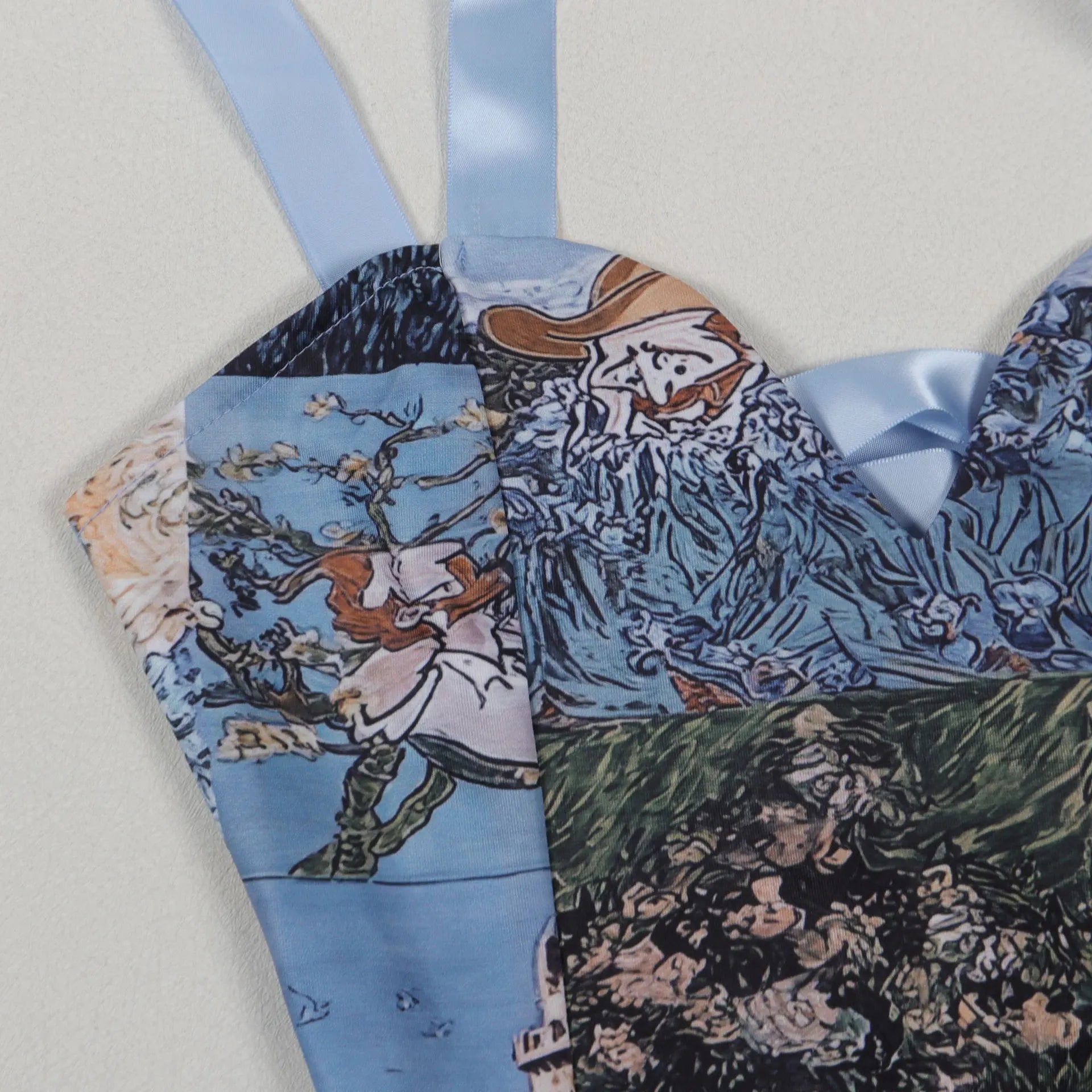 Sister Star Women's Oil Painting Ink Splash Printing Drawstring Tie Lace Multi-Pocket Loose Skinny Straight Pants Two Piece Set