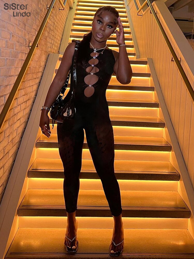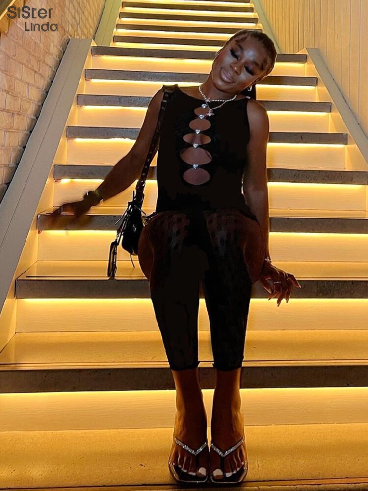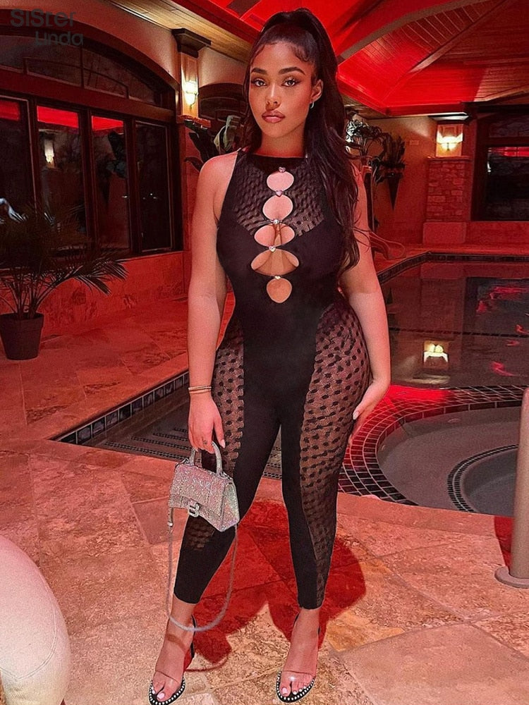 Sisterlinda Sexy Dot Hollow Mesh Jumpsuits Women Sleeveless Zipper O-Neck Bodycon Midnight Party Lady One Piece Playsuit Outfits