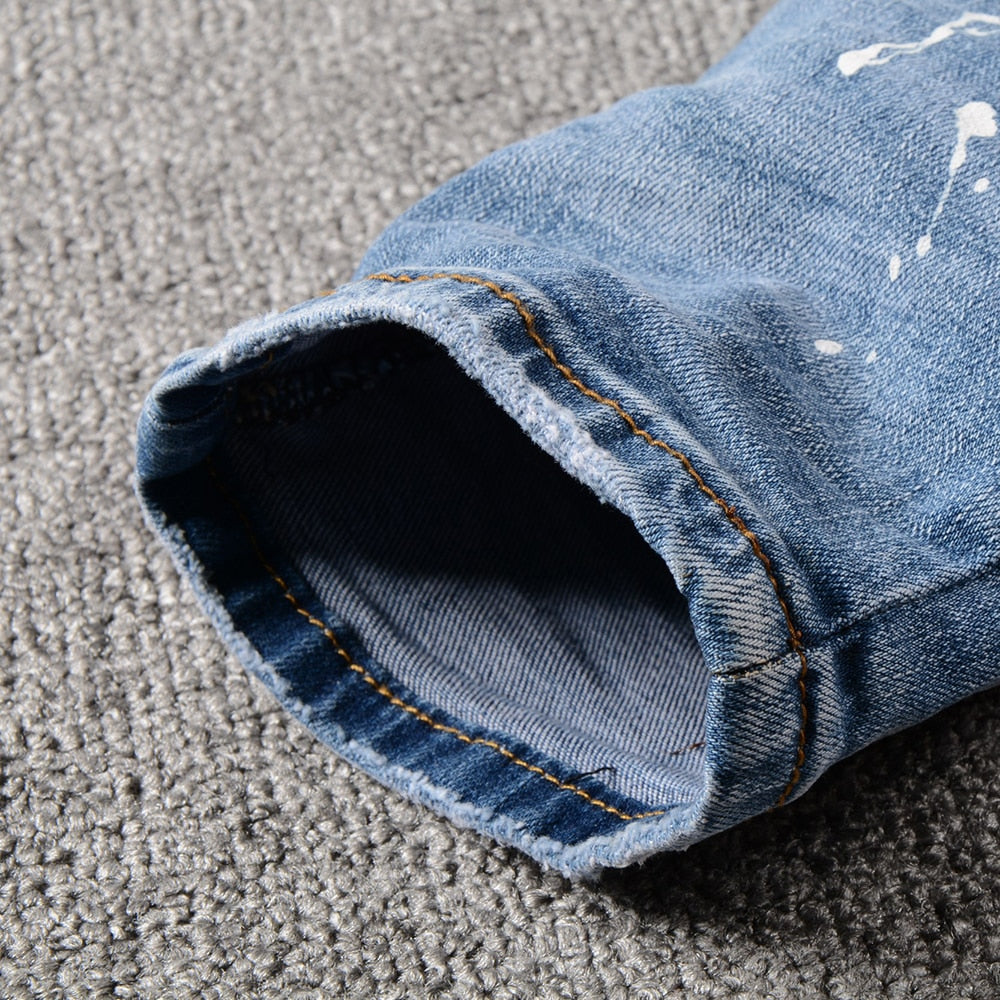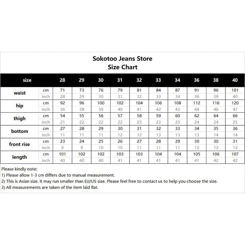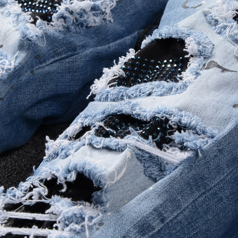 Sokotoo Men's rhinestone crystal patchwork light blue ripped jeans Slim fit skinny stretch denim pantsSPECIFICATIONS