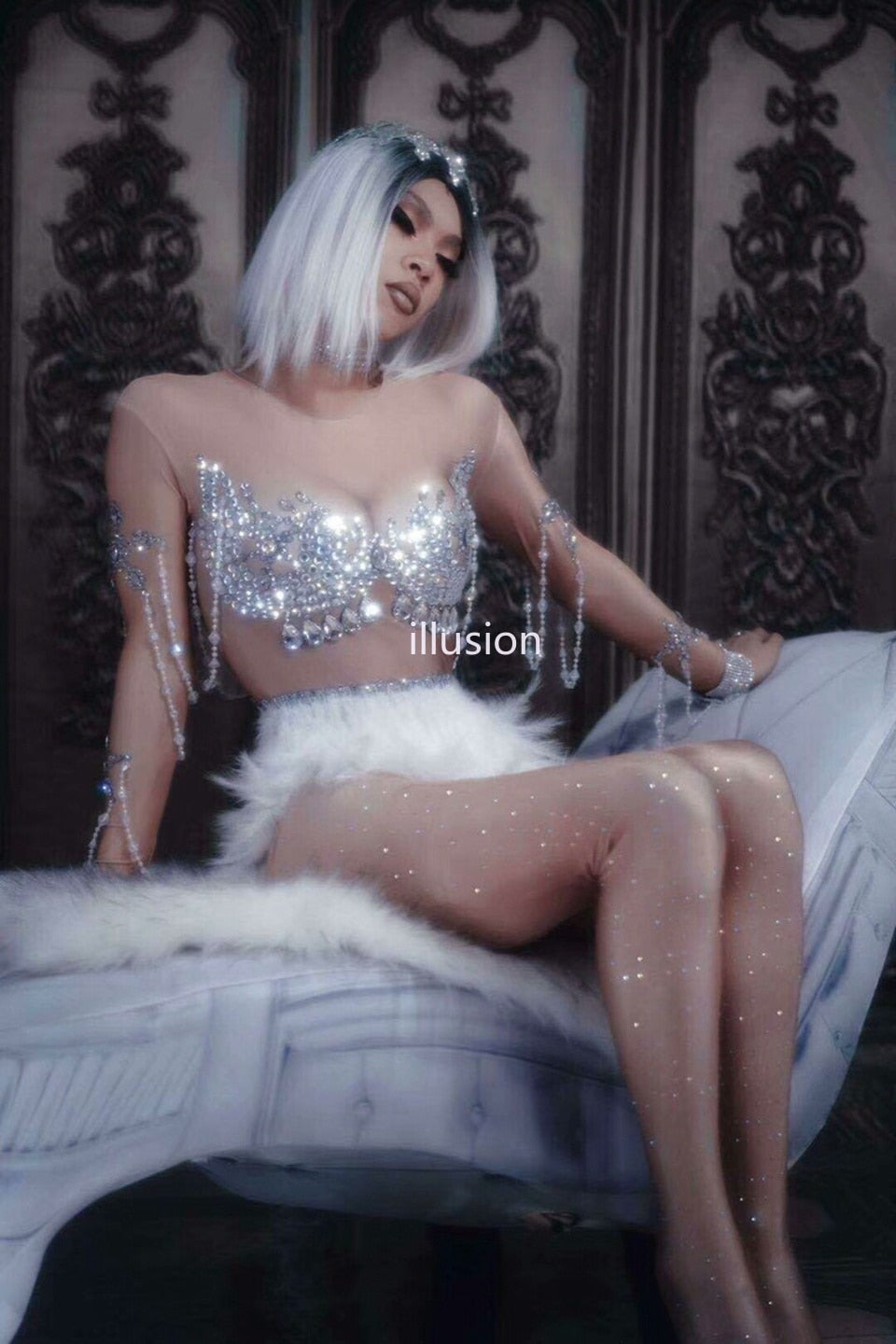 Sparkling Crystals Jumpsuit Nightclub Party Dress Women Sexy Skin Color Bodysuit White Feather Rhinestones Dress Dance Costume