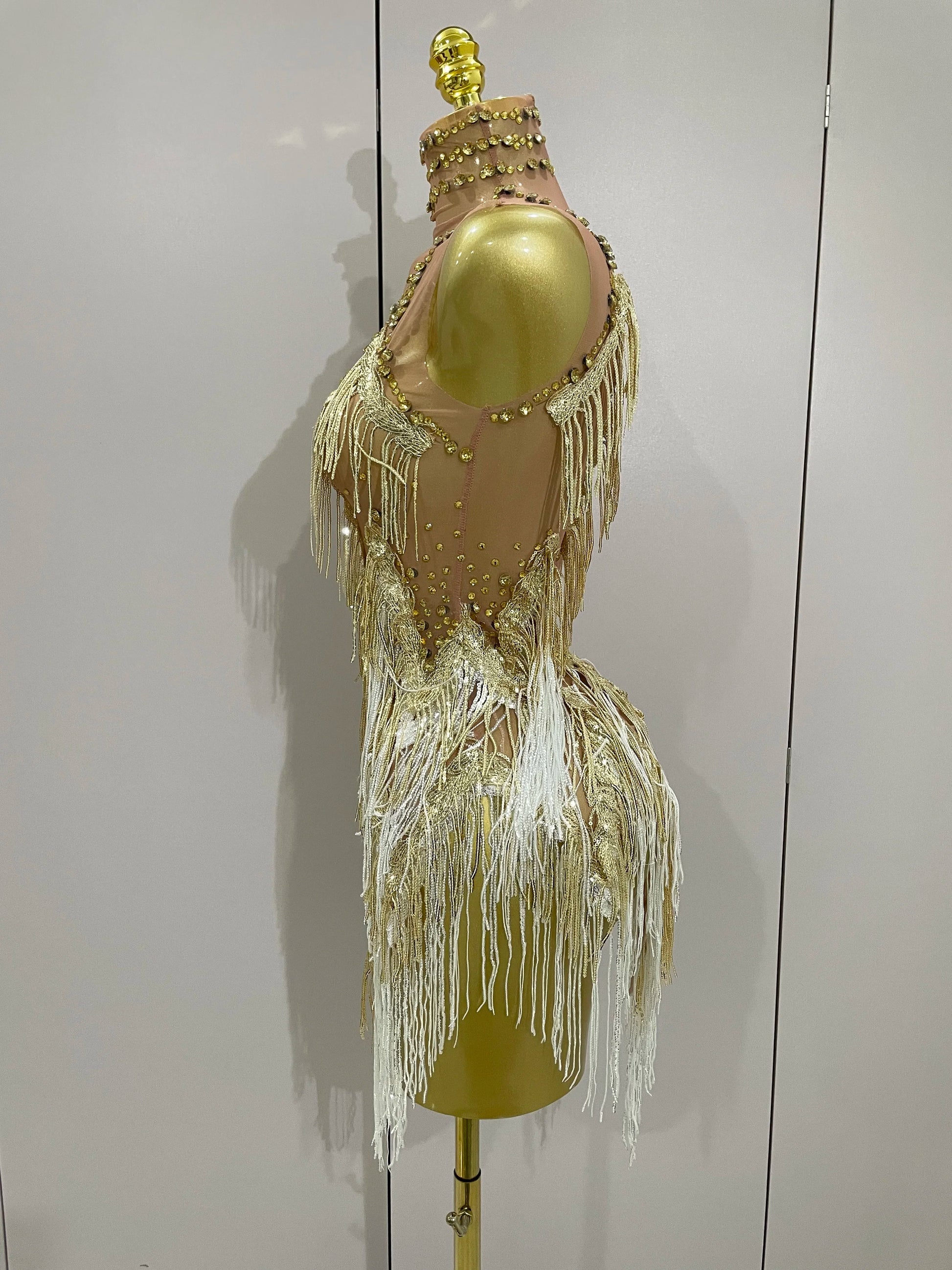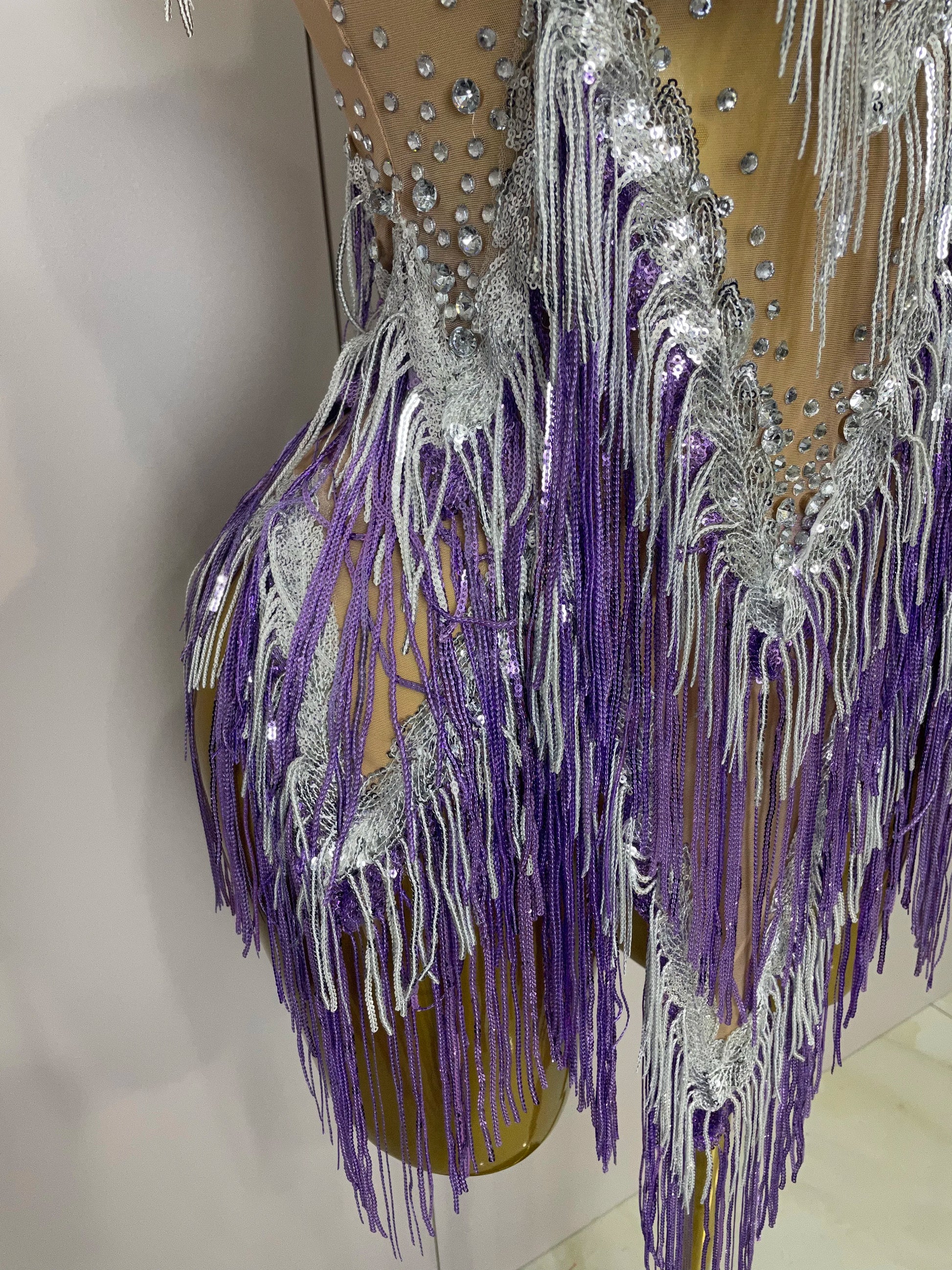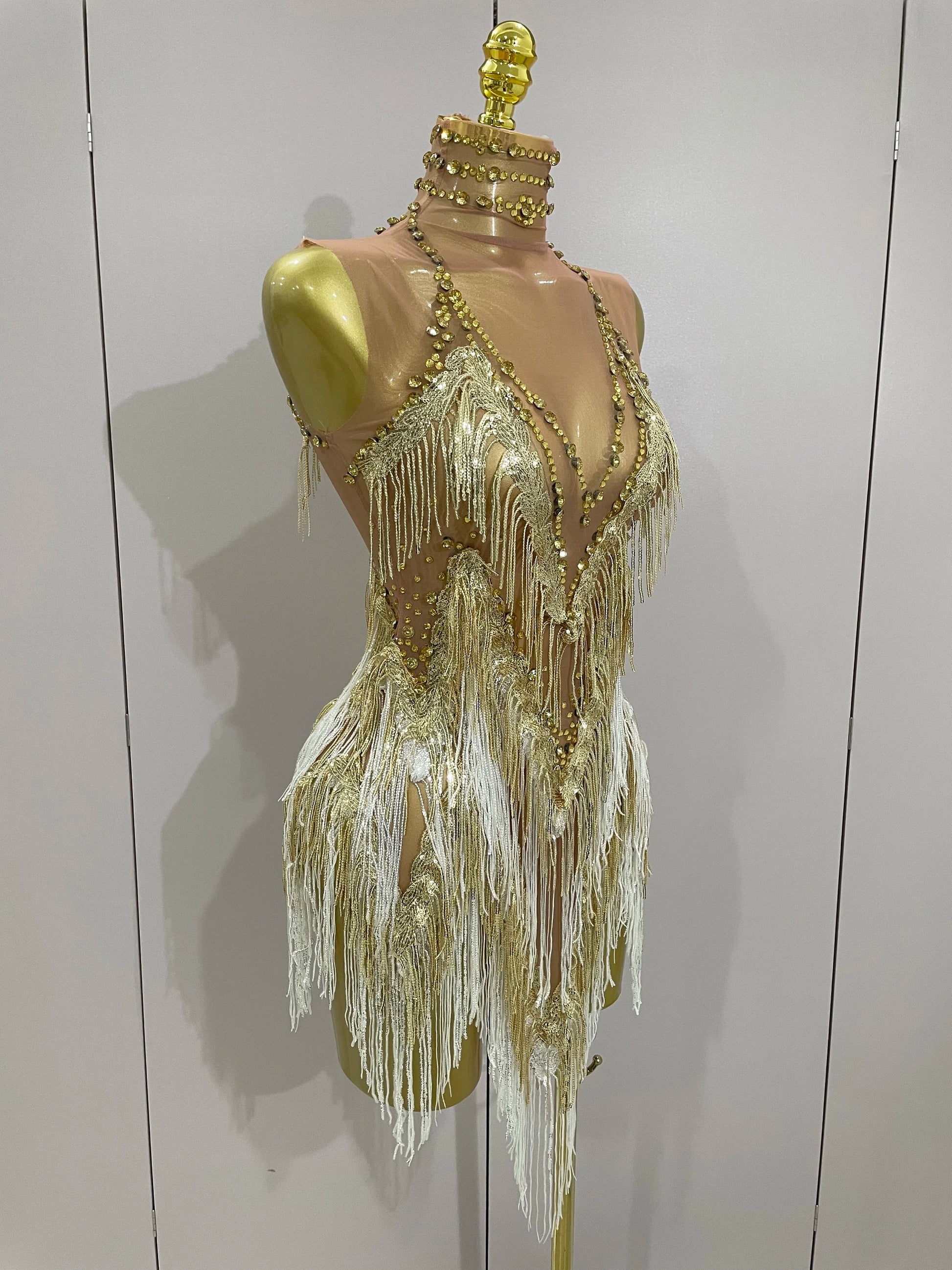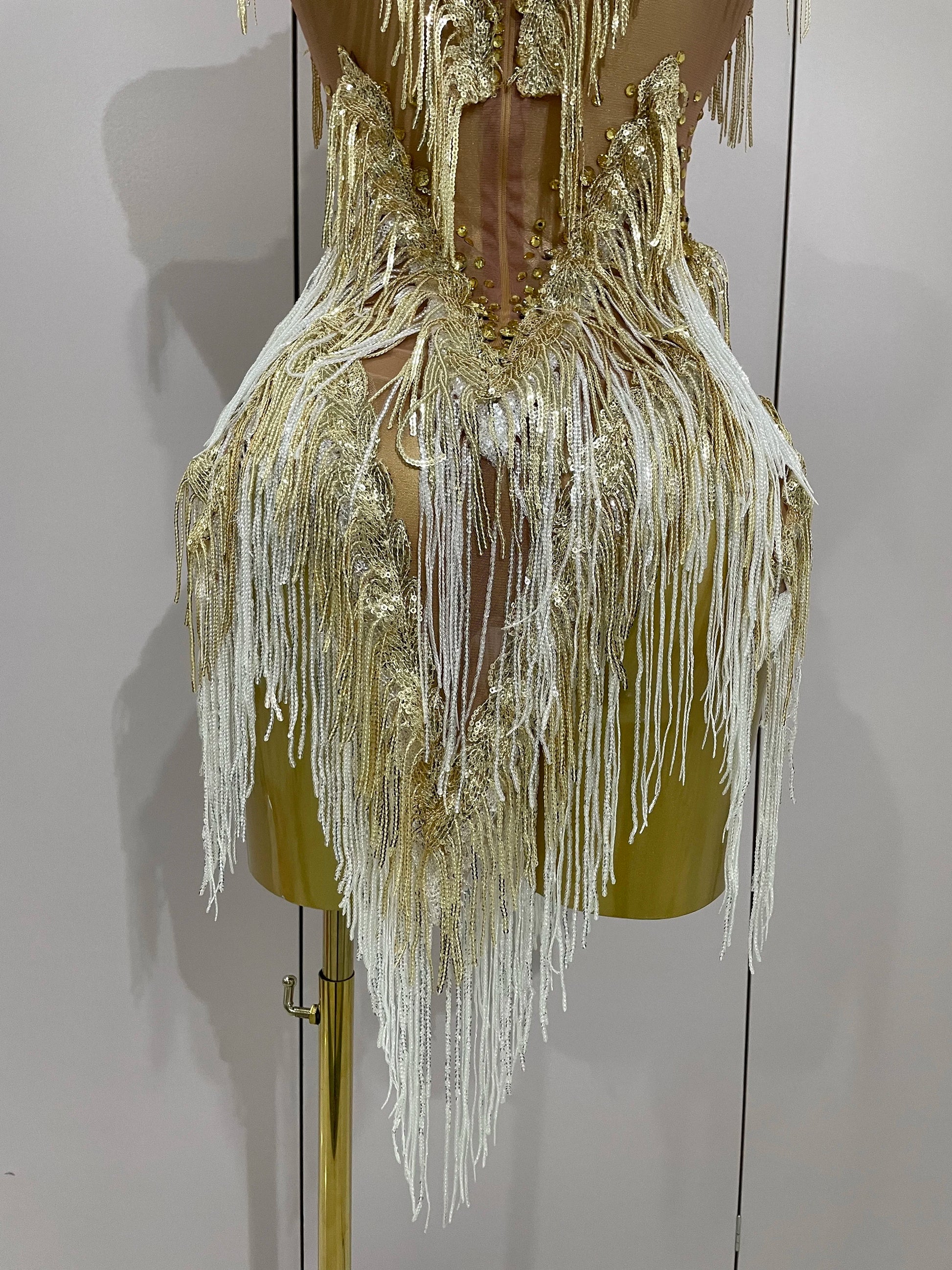 Stock 2025 Women Sexy Stretch Mesh Sparkly Rhinestone Tassels Mini Dress Nightclub Singer Dance Stage Costume Evening GownsSPECIFICATIONS