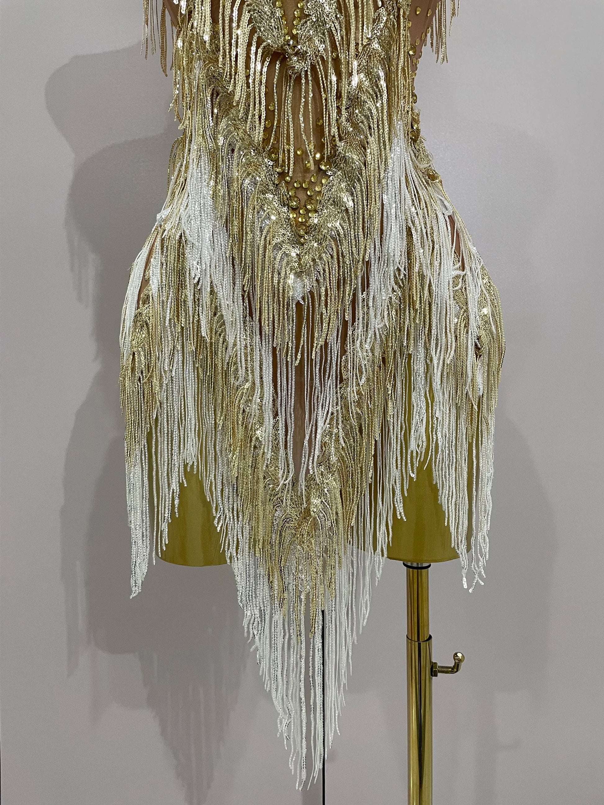 Best Selling Stock 2025 Women Sexy Stretch Mesh Sparkly Rhinestone Tassels Mini Dress Nightclub Singer Dance Stage Costume Evening Gowns