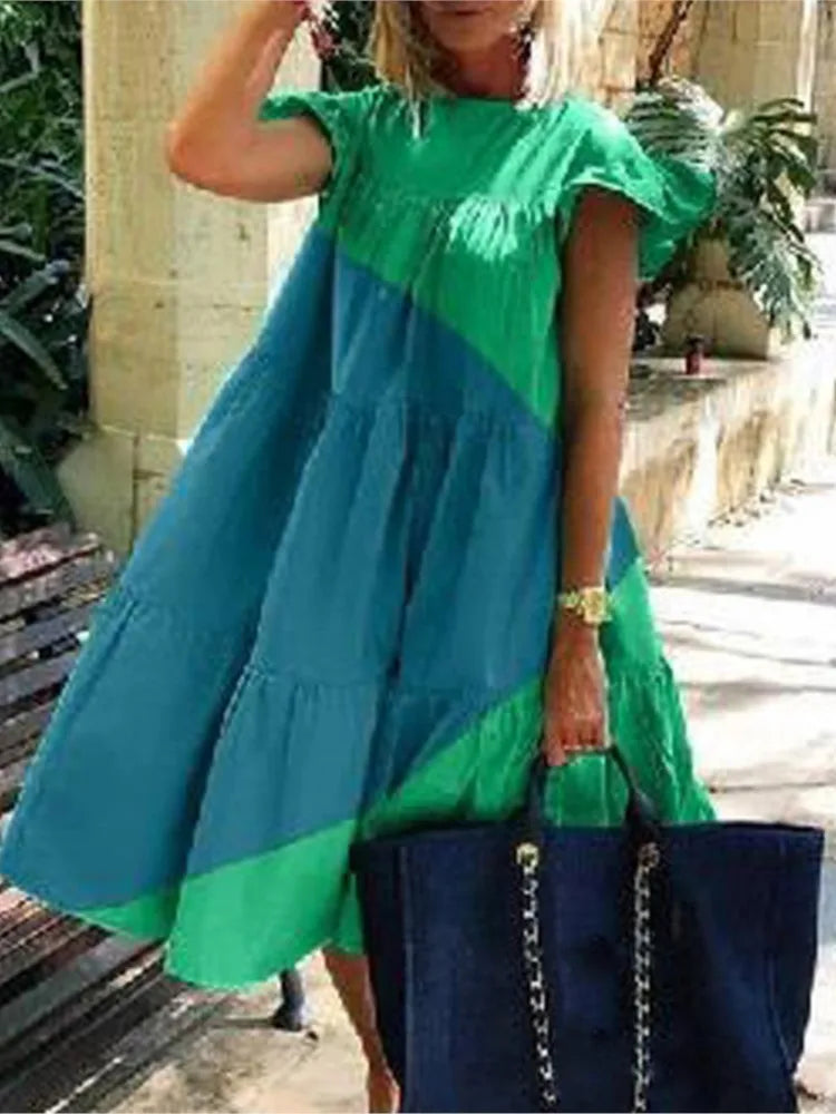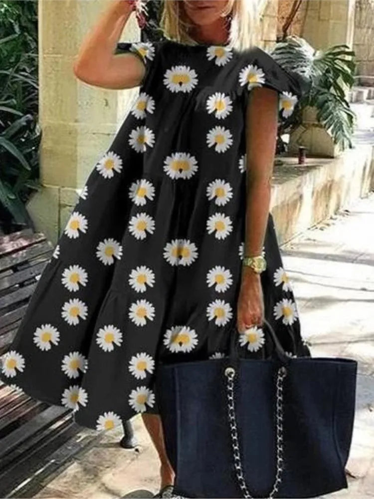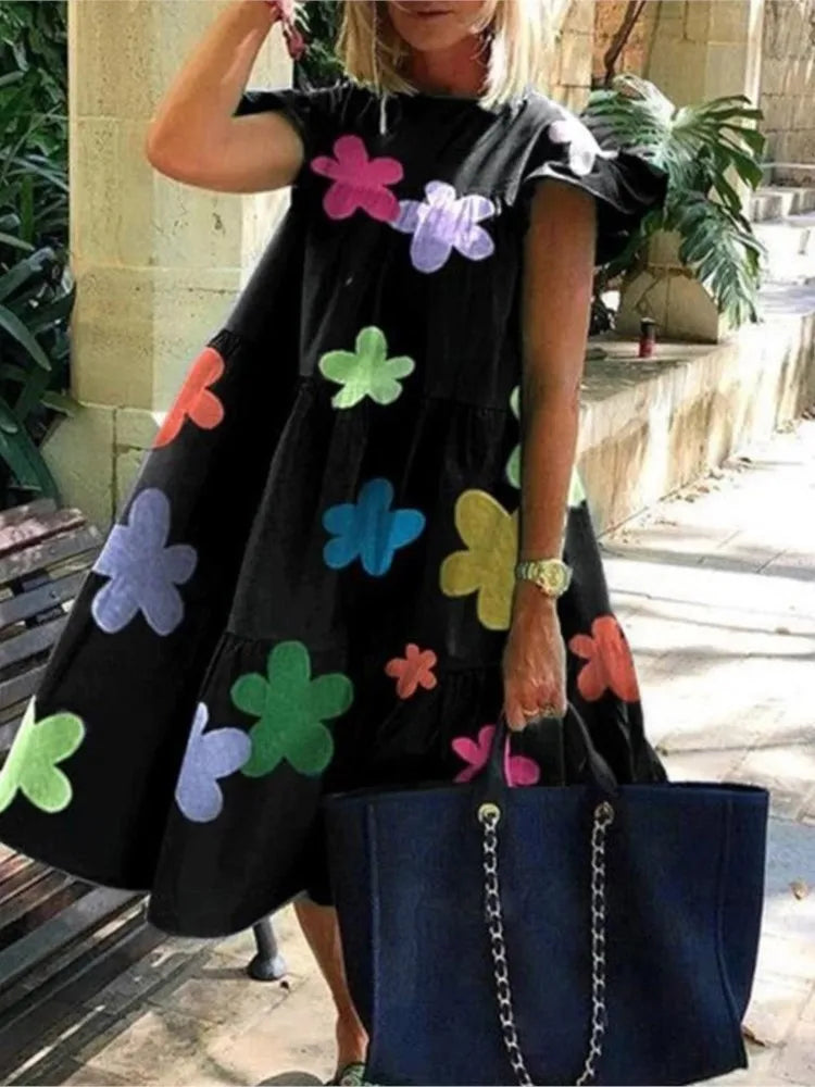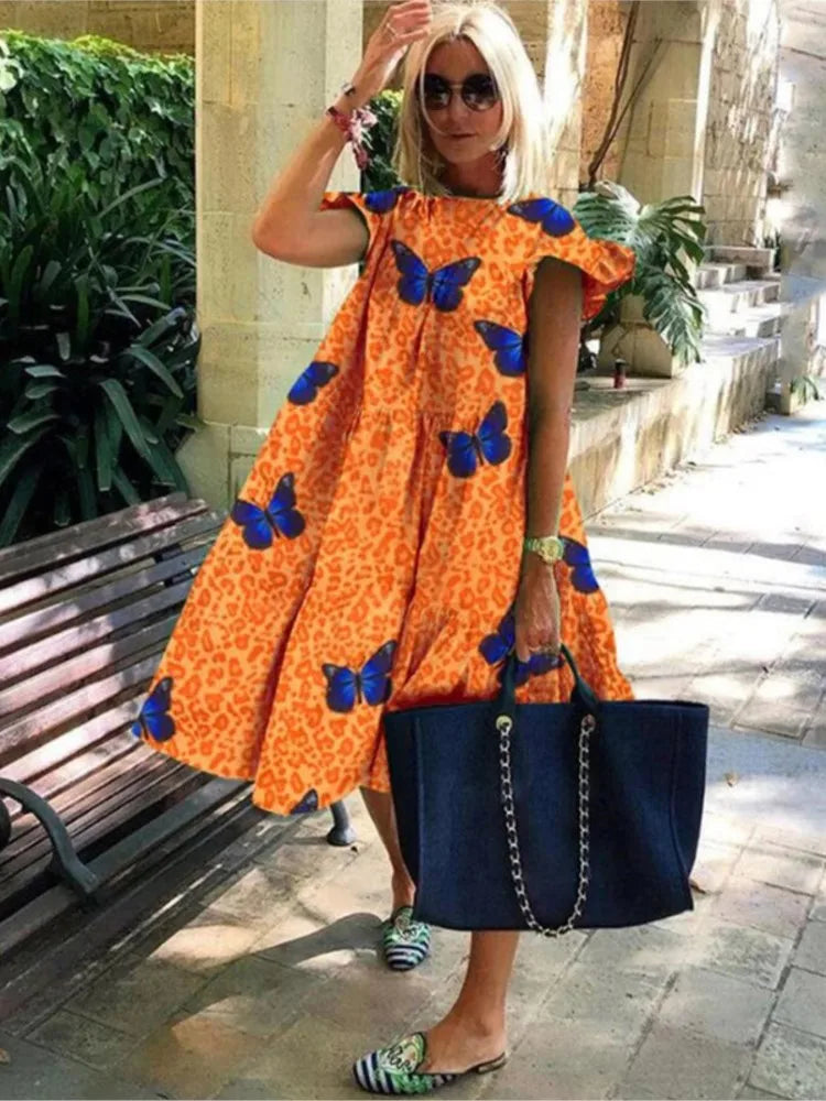 Summer Fashion Boho Print Dress Lady Casual O-Neck Pullover Ruffles Short Sleeve Loose Dresses For Women Holiday Beach Dress New