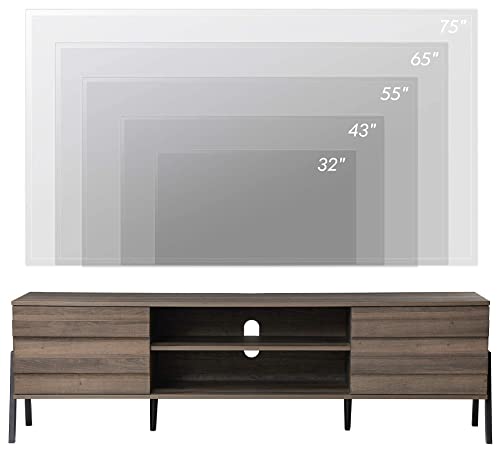 - 【Mid-Century Modern entertaiment center】The Television Stand is designed with dimensions of 68.4" L x 15.6” W x 20.9" H. Suitable For TVs up to 80 inch. Made from high grade certified MDF that promises a long service life. The overall finish is quite smooth and waterproof without any smell no harm and easier to clean, Weight limit of top board is 275 lbs.