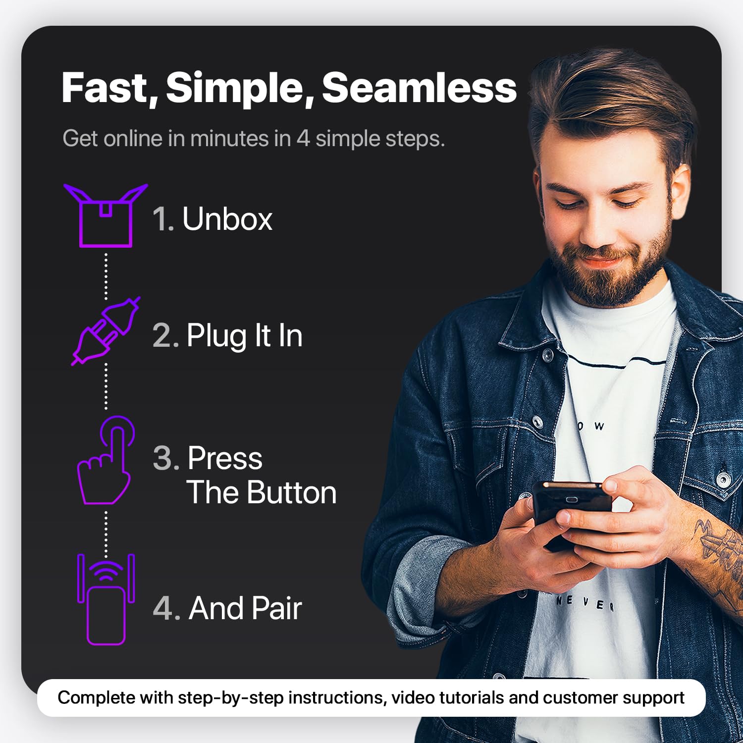 • Easy to Setup WiFi Extenders - Have your internet booster for WiFi ready in minutes. Simply unbox, plug in, hold near an internet router, and tap – it’s that easy. LED status indicators and a one-touch reset button further enhance user-friendliness