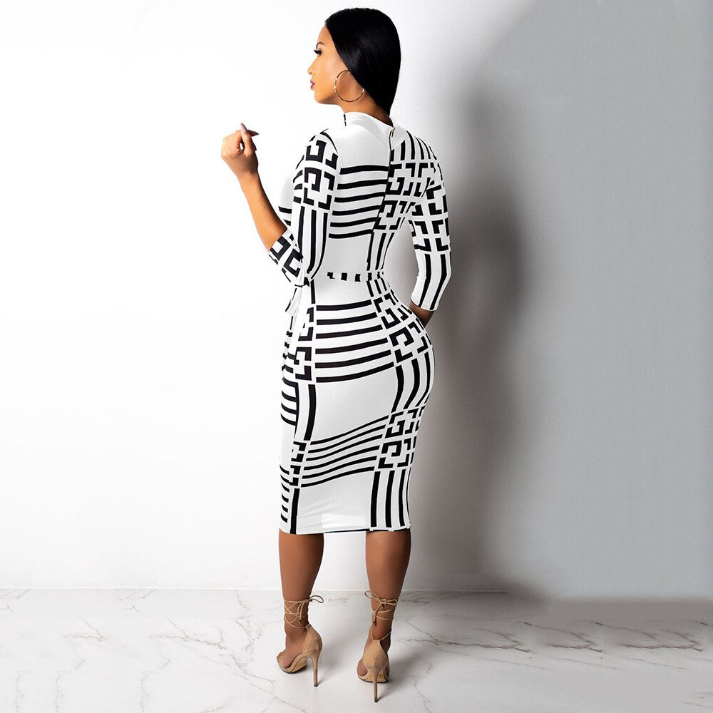 Women Sexy Turtleneck Short Sleeve Print Bodycon Midi Dress